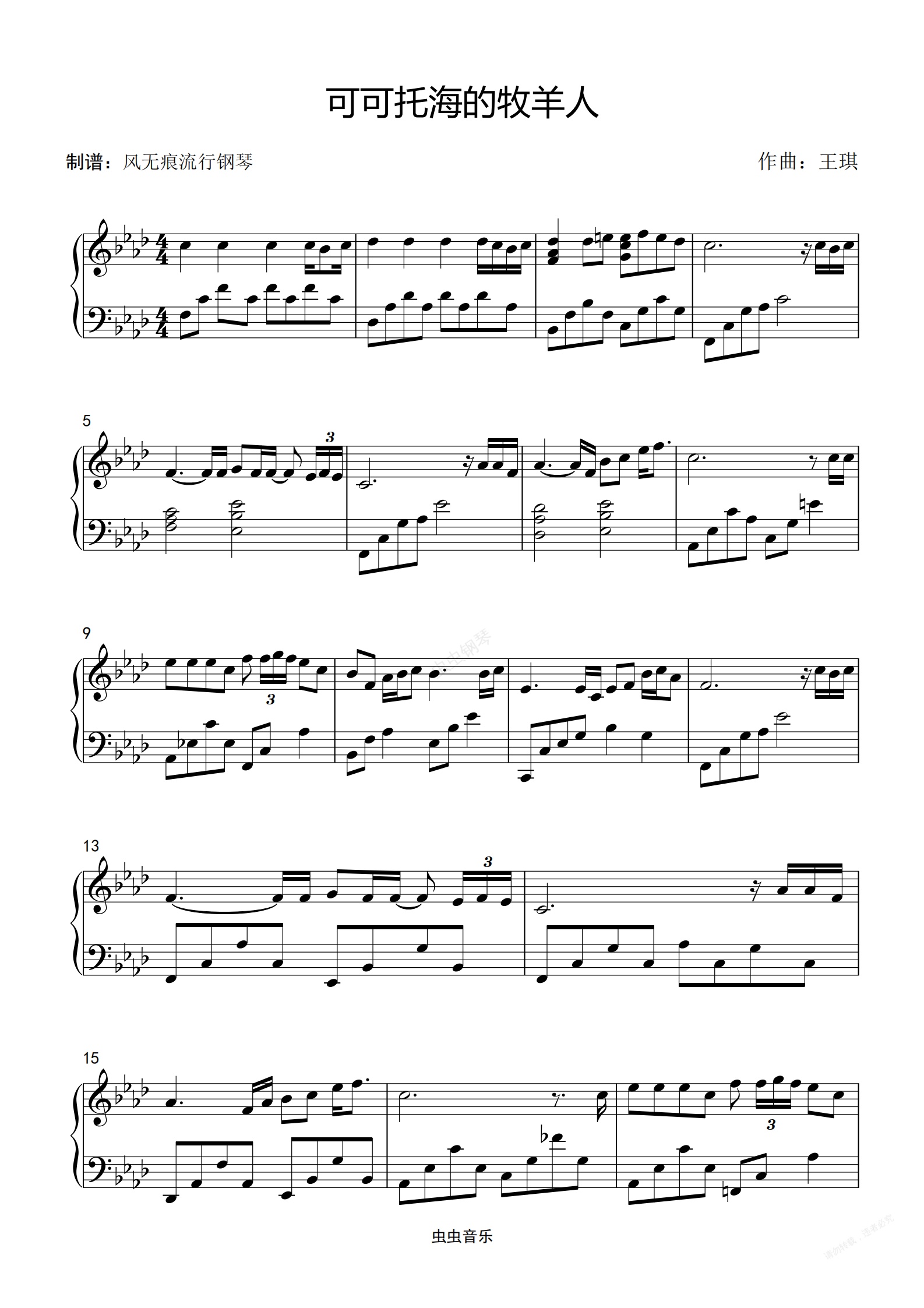 钢琴谱:原调-可可托海的牧羊人-王琪〖简易动听〗