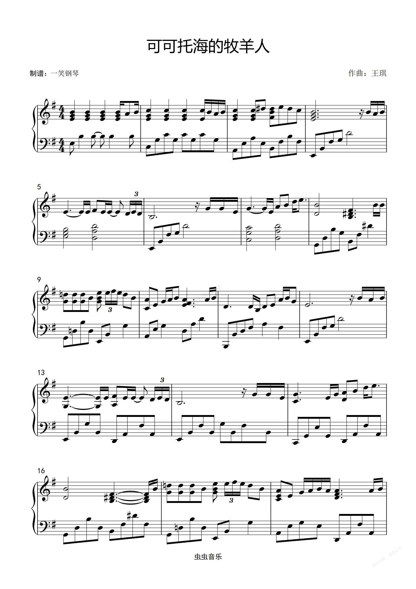 钢琴谱:G调-可可托海的牧羊人-王琪 【超级好听版】
