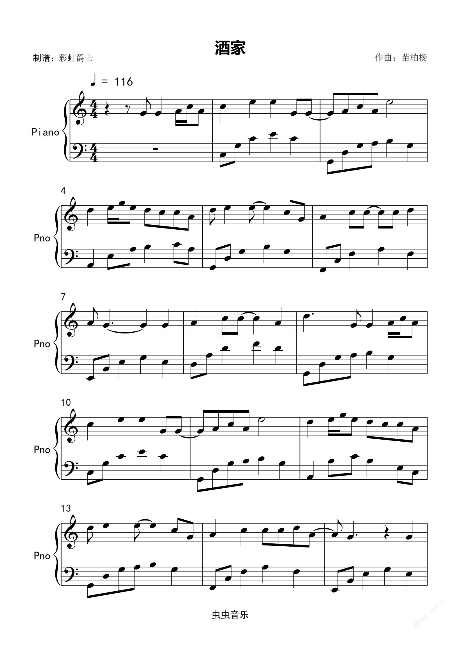 钢琴谱:酒家 c大调 简单版