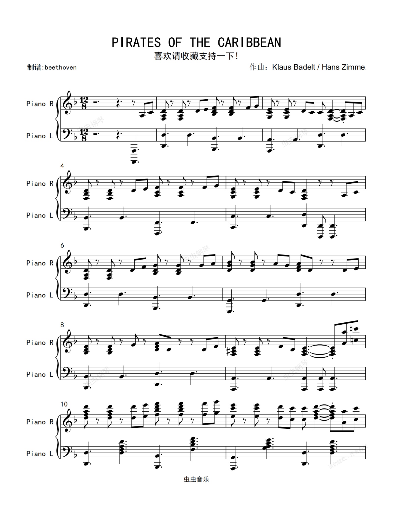 钢琴谱:加勒比海盗(he'sapirate)-独奏