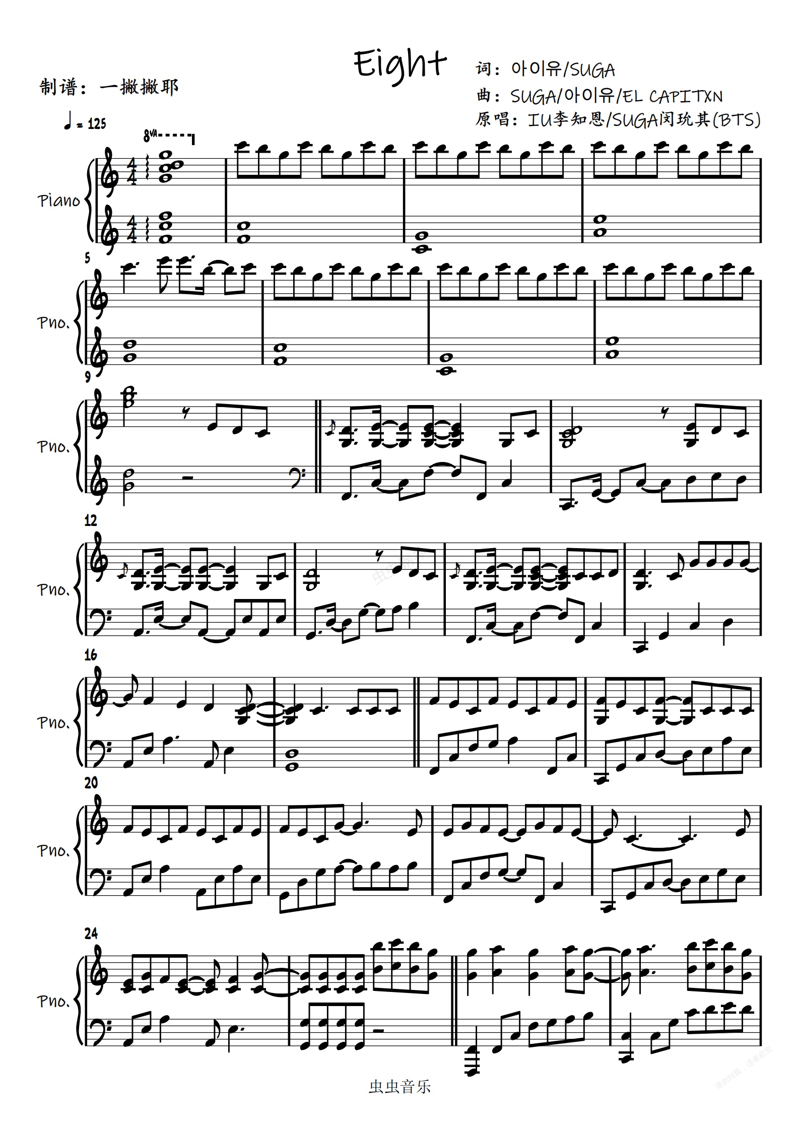 钢琴谱:Eight【C调独奏谱】IU李知恩/SUGA闵玧其(BTS防弹少年团)「一撇撇耶」