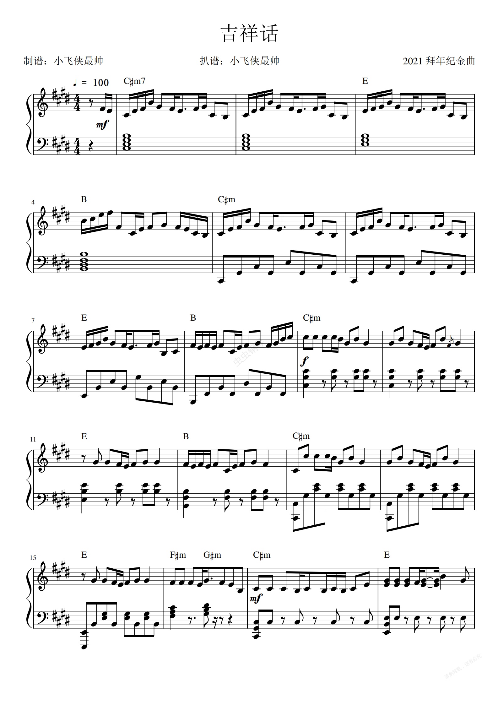 钢琴谱:吉祥话(含和弦)-2021拜年纪金曲