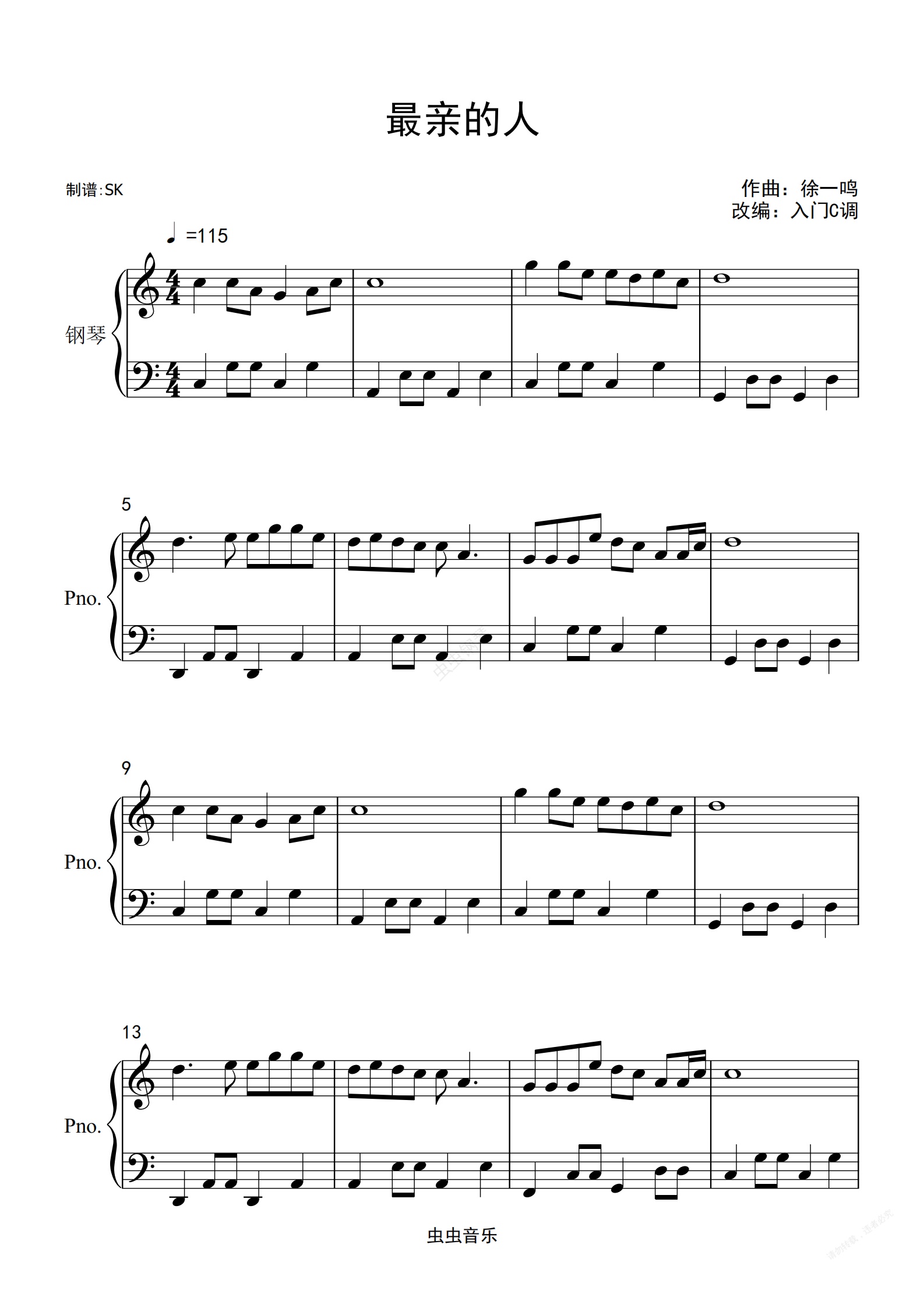 钢琴谱:岳云鹏《最亲的人》C调简单版