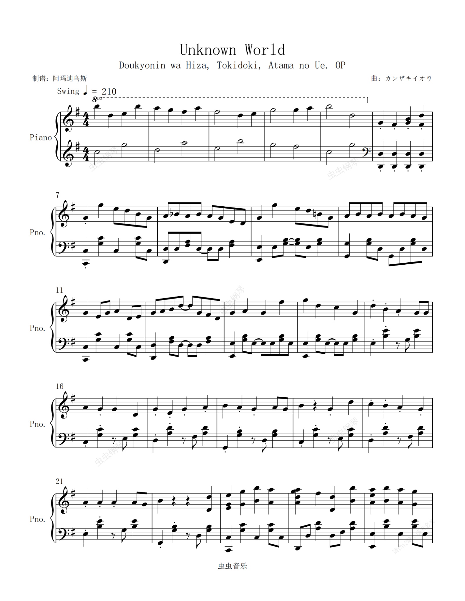 钢琴谱:同居人是猫 OP < Unknown World > ( アンノウンワールド ) ( 未知的世界 ) 原调高还原完整版本