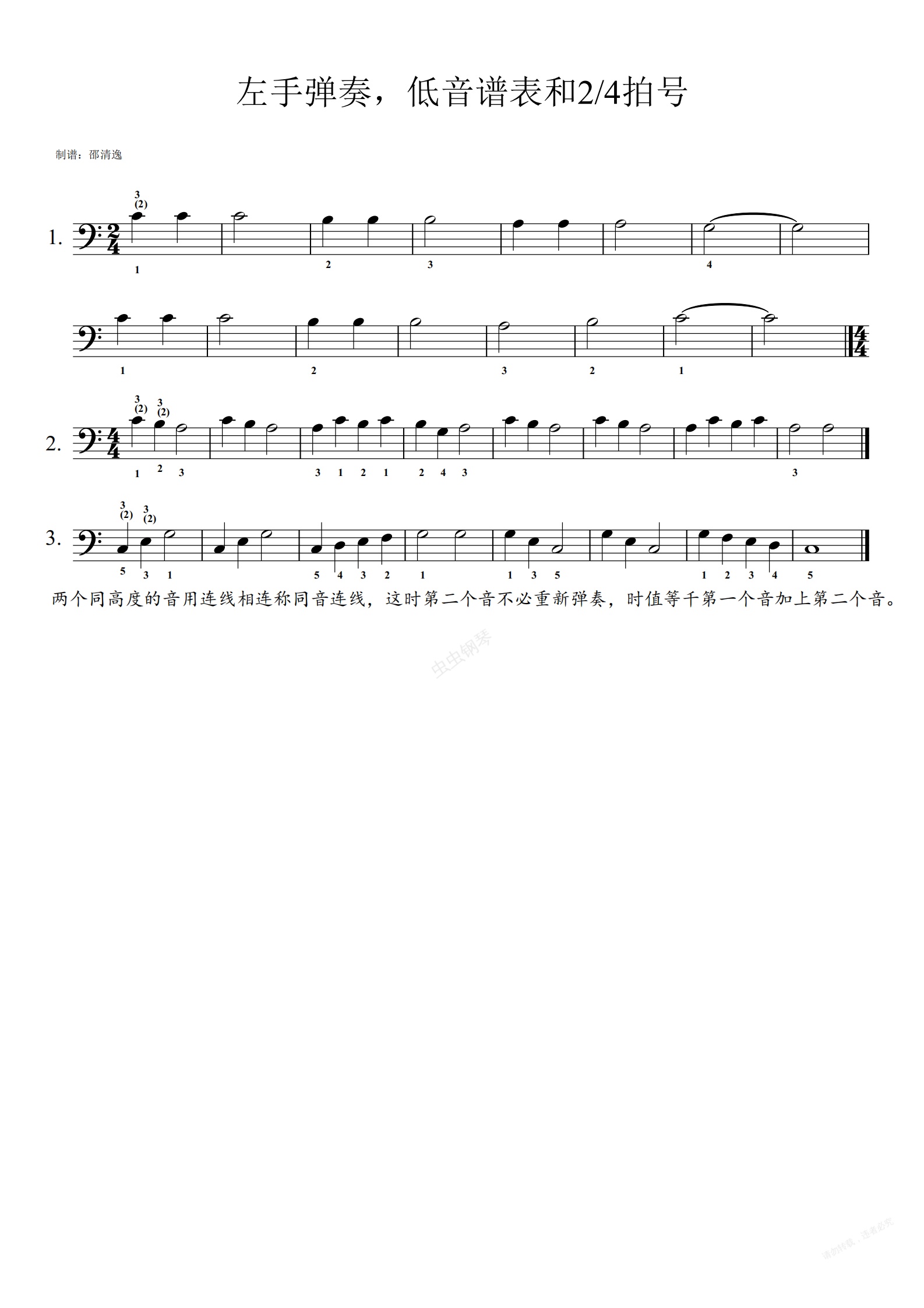 钢琴谱:钢琴基础教程1:2.左手弹奏,低音谱表和2 4拍号