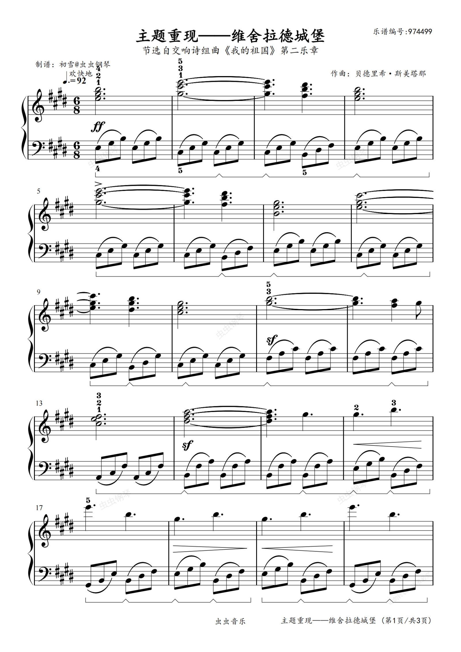 《伏尔塔瓦河》是斯美塔那的代表作、交响诗套曲《我的祖国》中的第二首交响诗。沃尔塔瓦河是捷克民族的摇篮,在捷克人民心中有着特殊的地位,被捷克民族称为“母亲河”。这是一首充满魅力的抒情诗般的交响音乐,也是斯美塔那所作的最为宜于人们接受的作品。1874年首次公演就受到公众的热烈欢迎。这首富有感染力的、流畅自然的e小调旋律在全曲中起着主导的统一的作用。而森林狩猎的音乐乡间婚礼的民间波尔卡与主题音乐有机的结合。乐曲最后转为E大调,显示了沃尔塔瓦河流向布拉格的更加壮阔于气势雄伟。