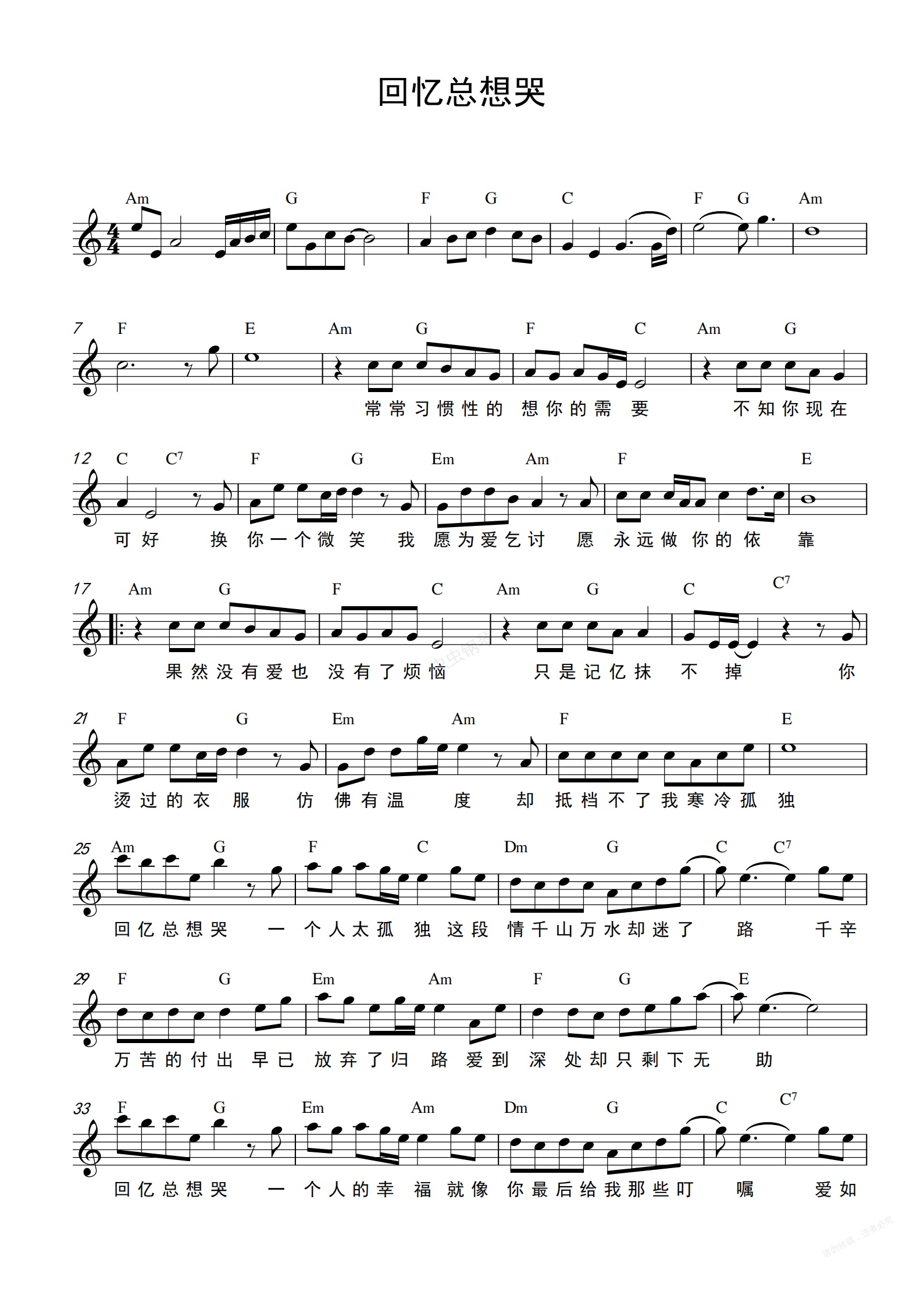 钢琴谱:回忆总想哭 和弦谱