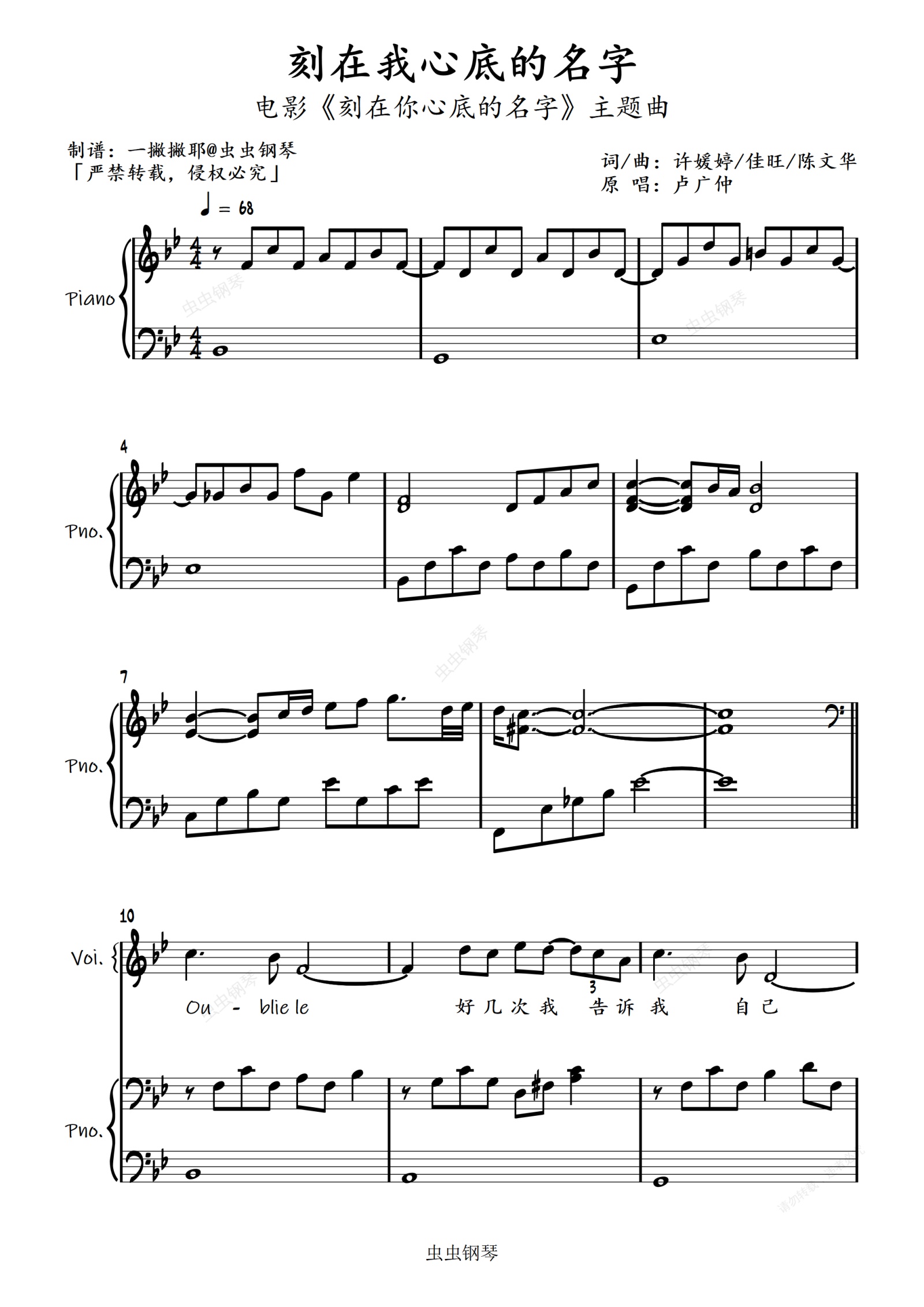 钢琴谱:【原调完美弹唱】刻在我心底的名字-卢广仲「一撇撇耶」