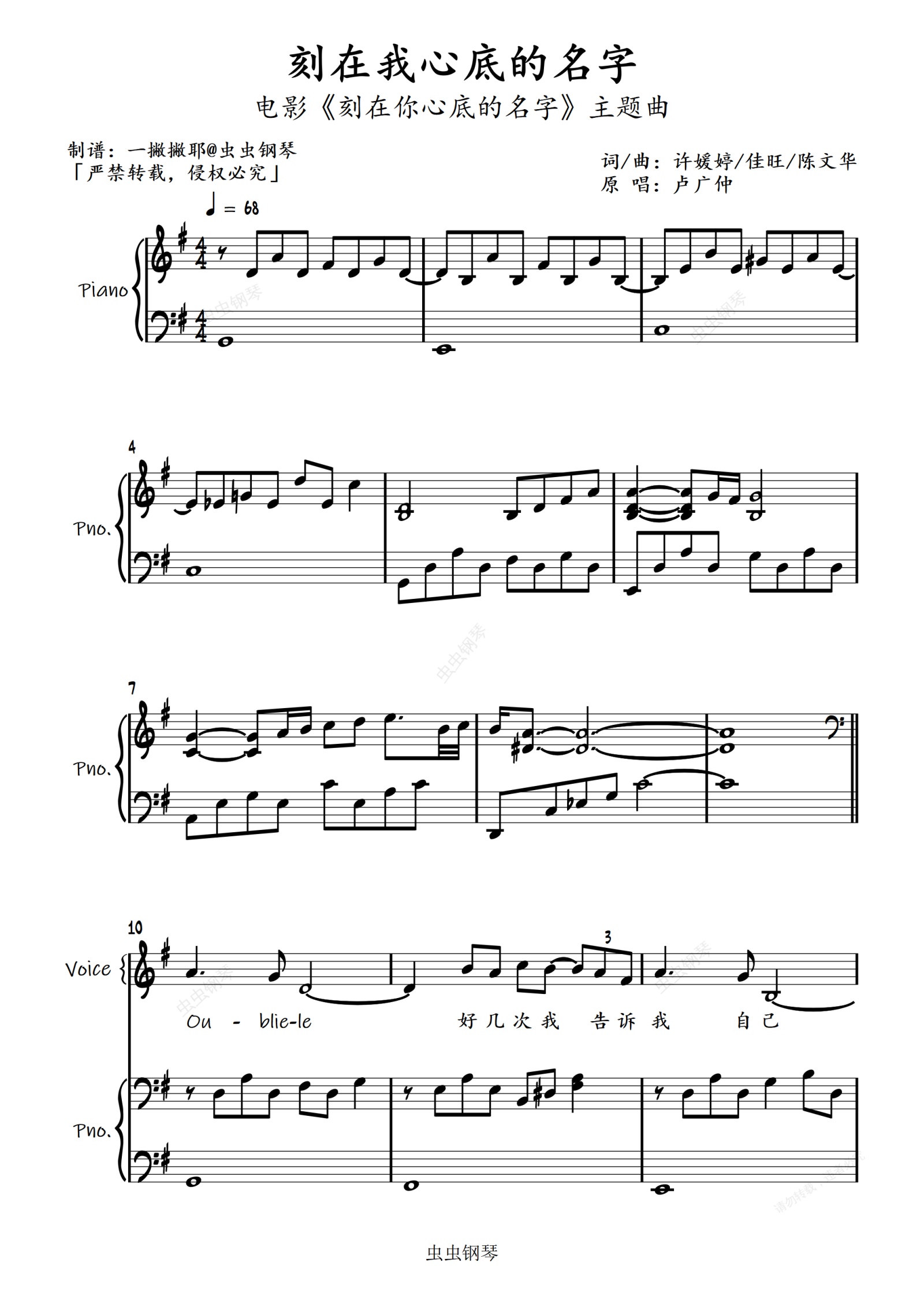 钢琴谱:【降调版弹唱谱】刻在我心底的名字-卢广仲「一撇撇耶」