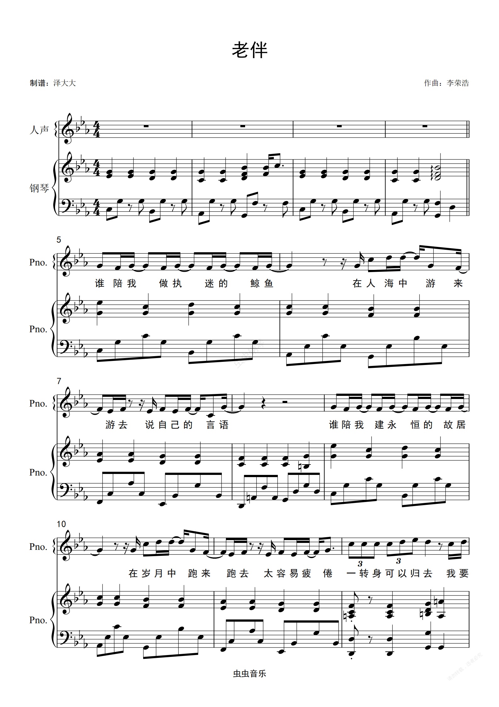 钢琴谱:老伴【精编伴奏弹唱附词】李荣浩