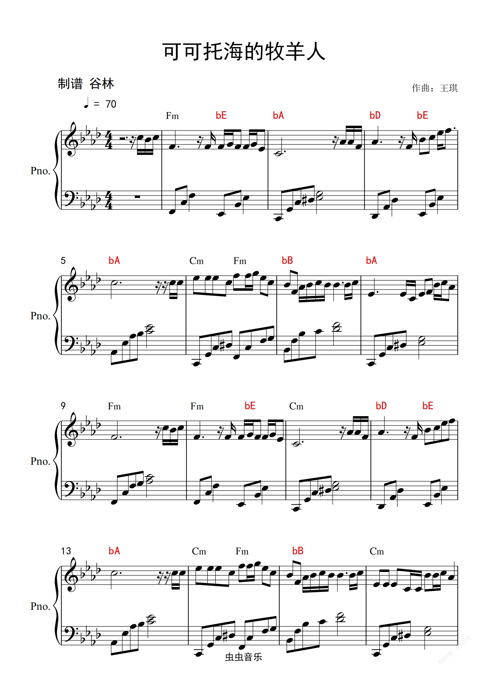 钢琴谱:《可可托海的牧羊人》原调带和弦弹唱标记