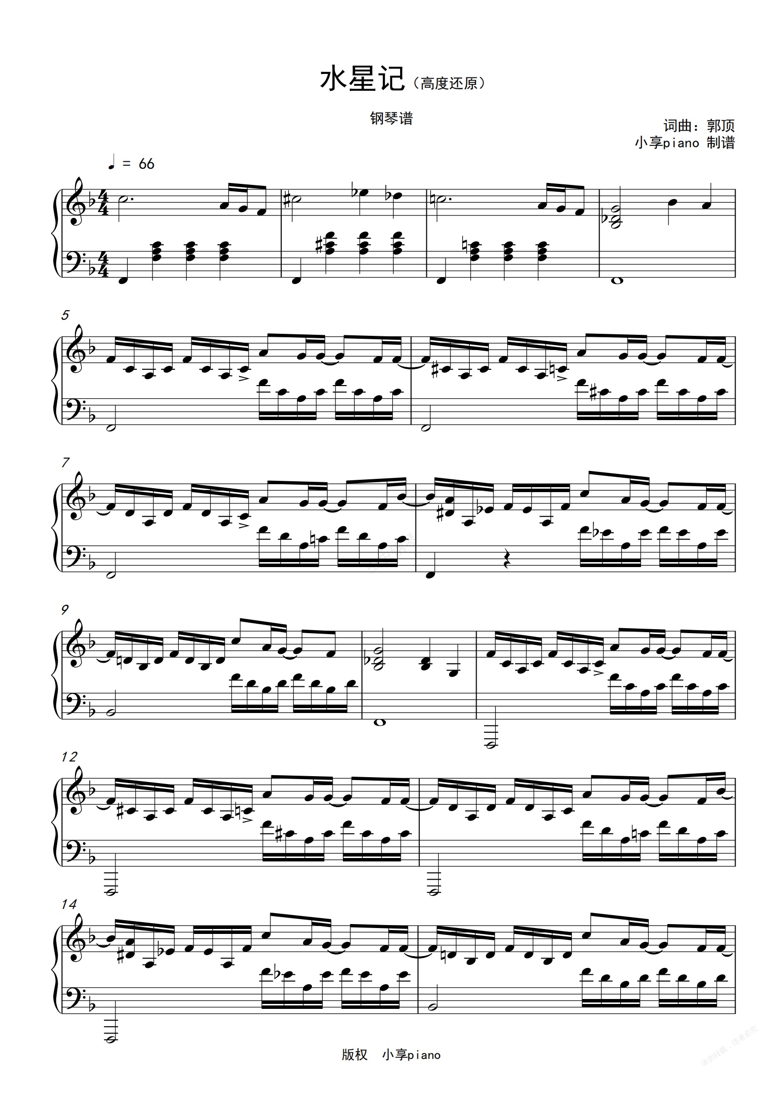 钢琴谱:《水星记》郭顶 高度还原 钢琴独奏