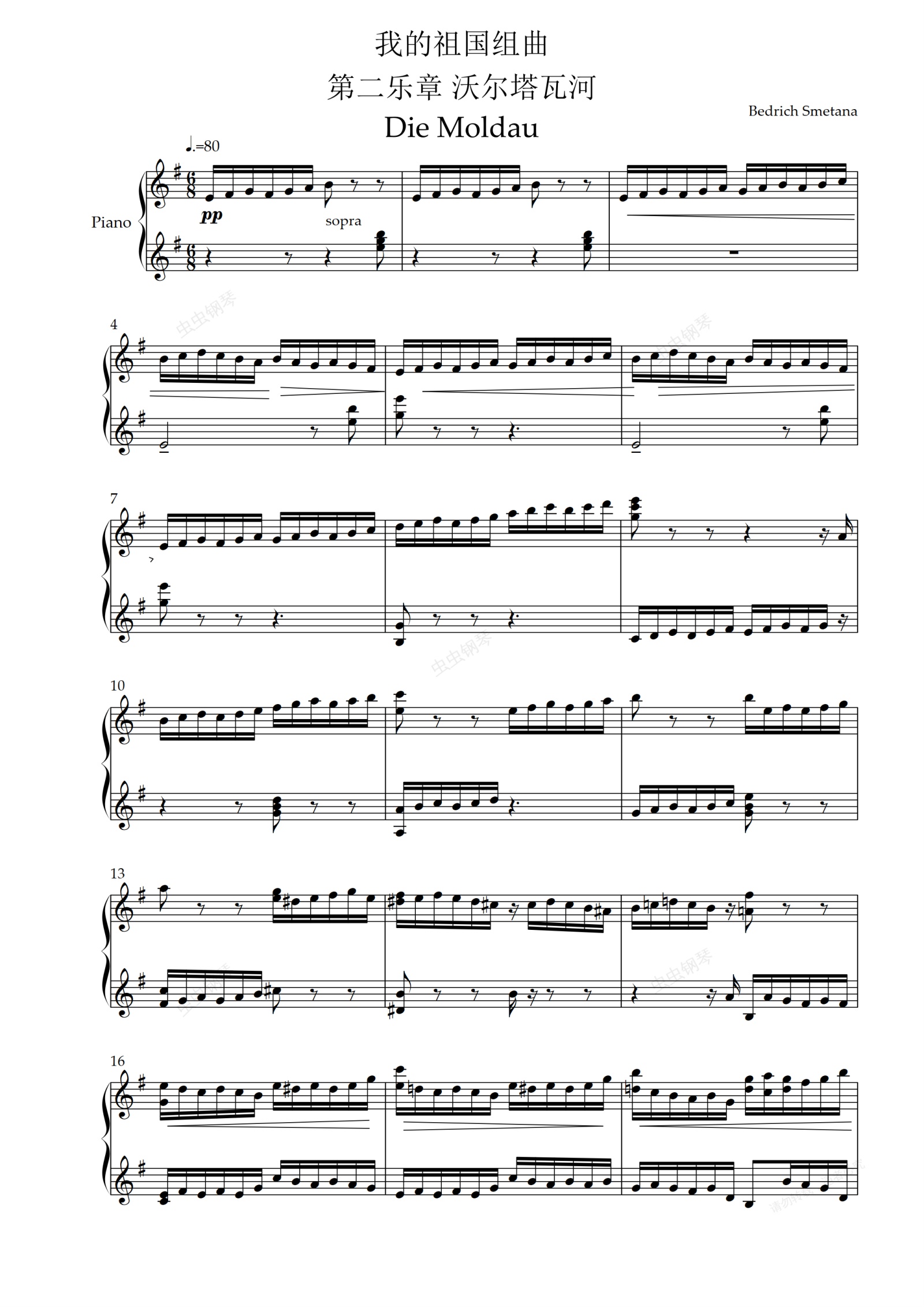 沃尔塔瓦河是捷克最大的河流,它由南北纵贯捷克国土,是捷克人民赖以生存的母亲河,是捷克民族繁荣昌盛的摇篮,在捷克人民心中占有重要的地位.交响诗《沃尔塔瓦河》,从河水的源头开始描写,逐渐映现出奔腾不息的河流、岸边茂密的森林、富有生气的乡村、宁静的月夜、险要的峡谷、古老的城堡,这些景致与民俗生活和神话传说相联系,展示了捷克山河的美丽和悠久的历史文化.