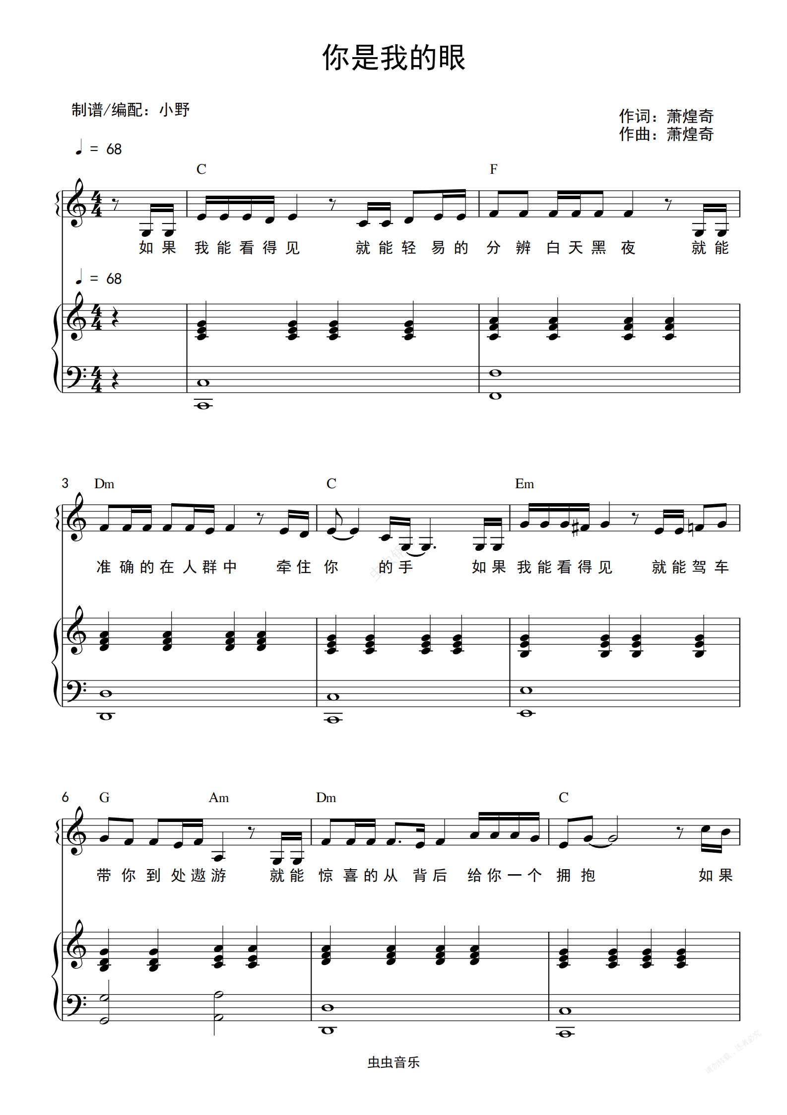 钢琴谱:你是我的眼(和弦弹唱版)