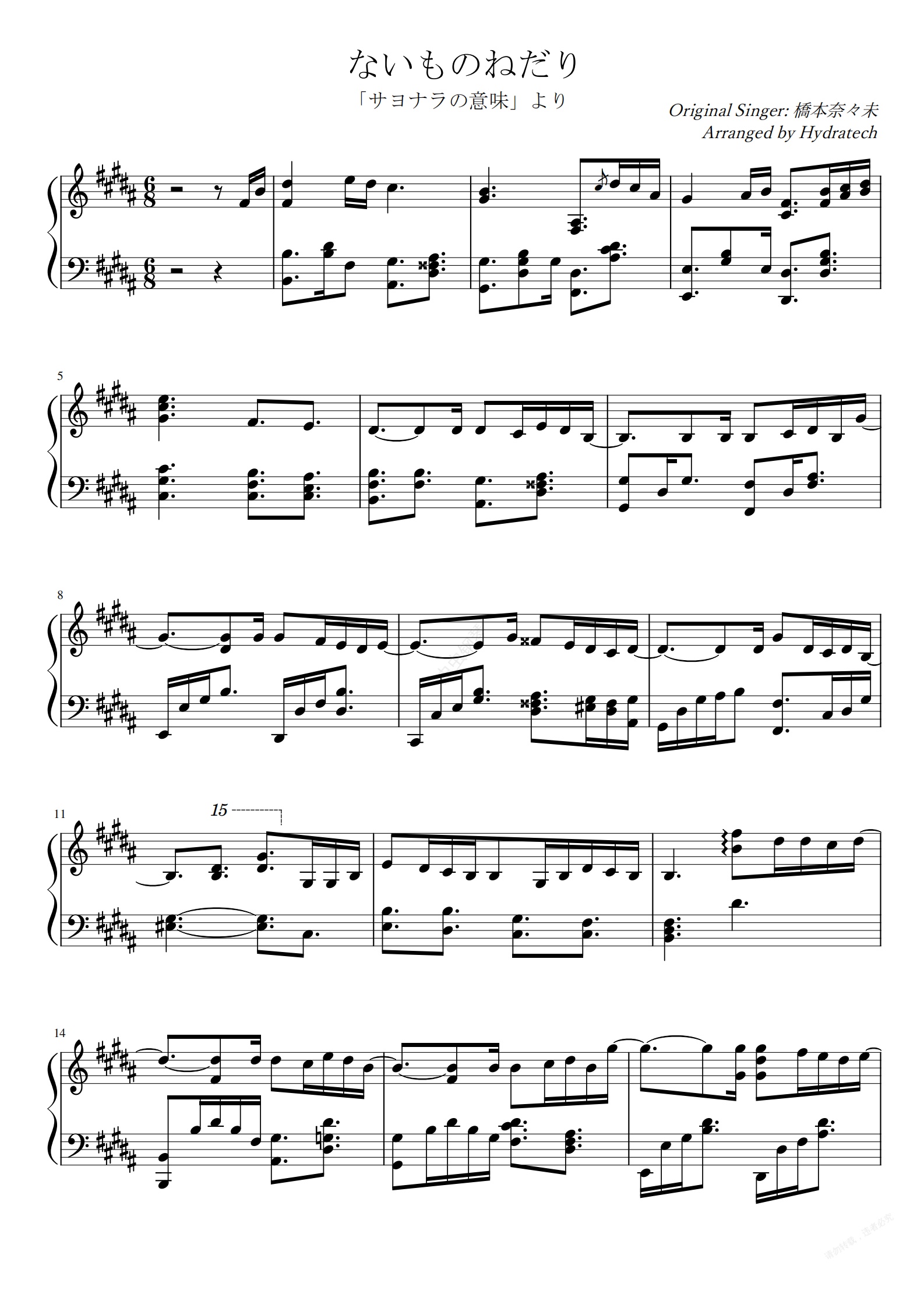 乃团16单「サヨナラの意味」中桥的solo曲《强人所难》;其实这首歌是里的,但我很喜欢的这张封面特写。个人心目中这首歌排到坂道top都不为过,或许有情怀加持的作用吧(5周年第一天那段独唱无论是场面效果还是感情效果都太杀了),歌词、旋律都无比动人。我印象里大佬好像翻奏过吧,发没发谱我不知道,但是把整曲风格都改了;怎么说呢,其实本来原曲有些织体并不适合键盘,比如前奏入Verse主歌部分的滑音,副歌结尾的假高音,对于钢琴就是无解的旋律;的版本剑走偏锋,强调了本来这首歌中就隐含的swing风格,让人有一点上世纪美国爵士乐的恍惚感,但是「沈痛」要素就不足了。本着这一点我还是尽量还原了原曲的旋律。(试听为Midi音频)(本人非音专,编配及制谱如有谬误请多指教)