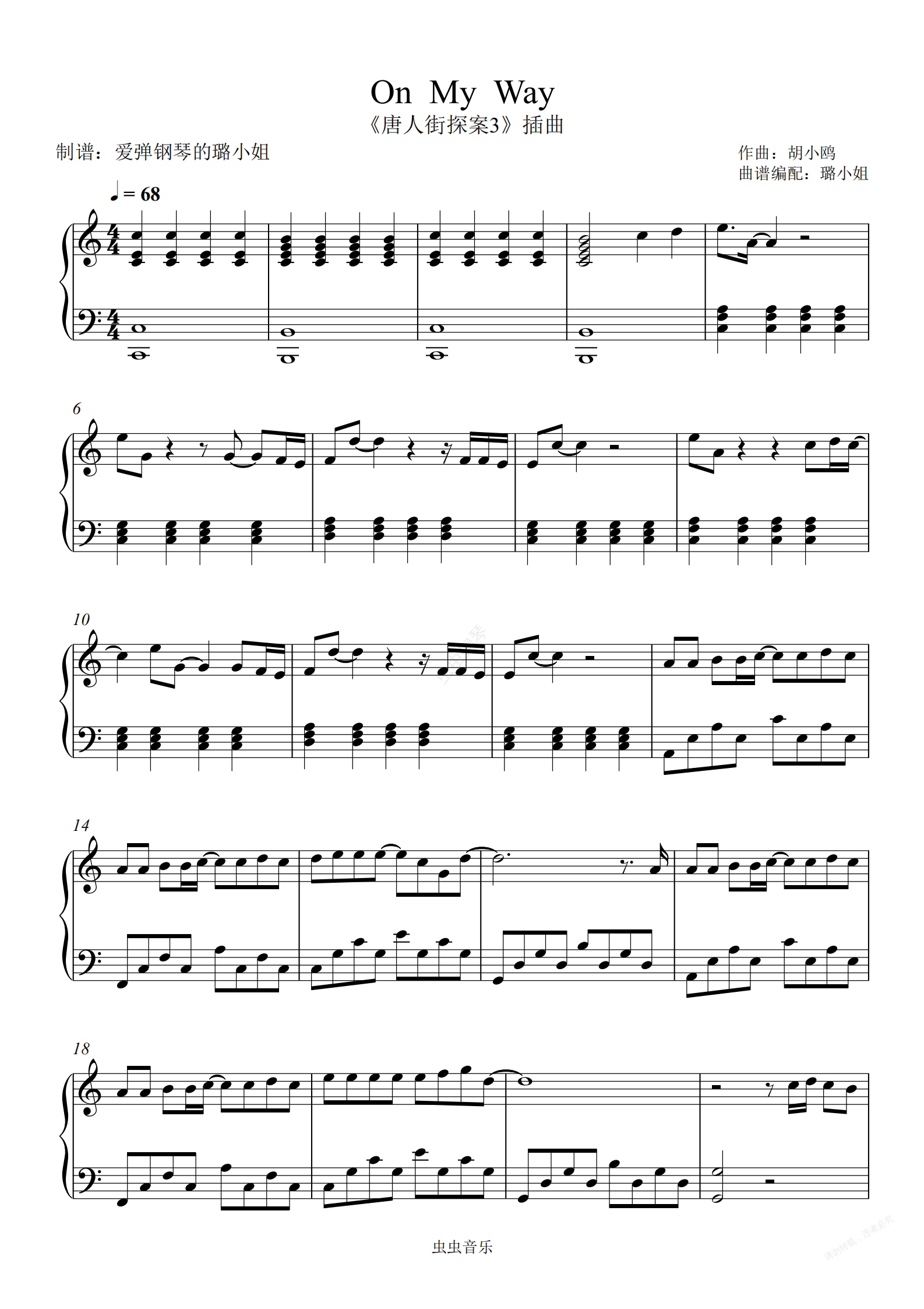 钢琴谱:On My Way(唐人街探案3插曲)- C调简单完整版