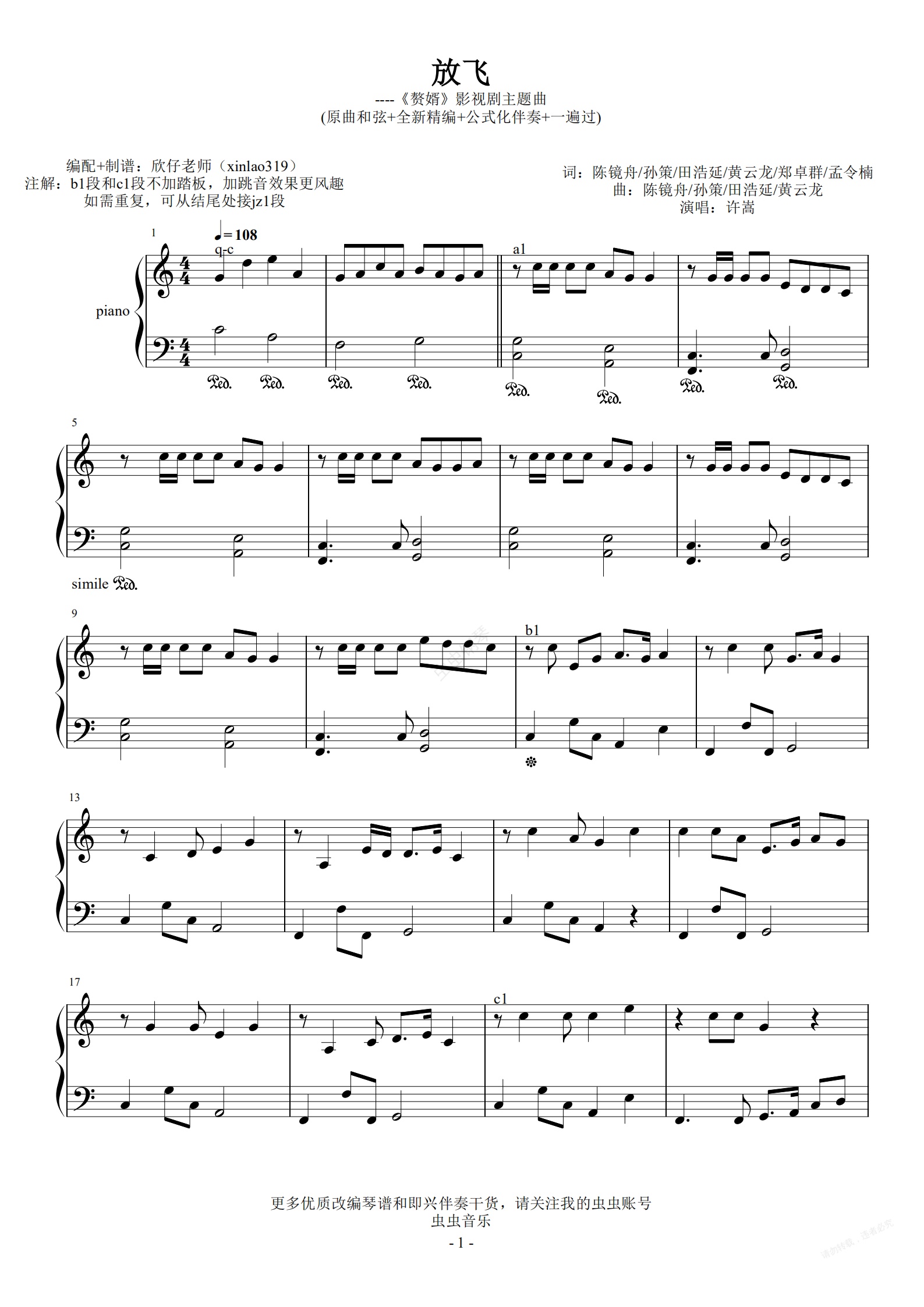 钢琴谱:许嵩-C调-《放飞》(《赘婿》主题曲)