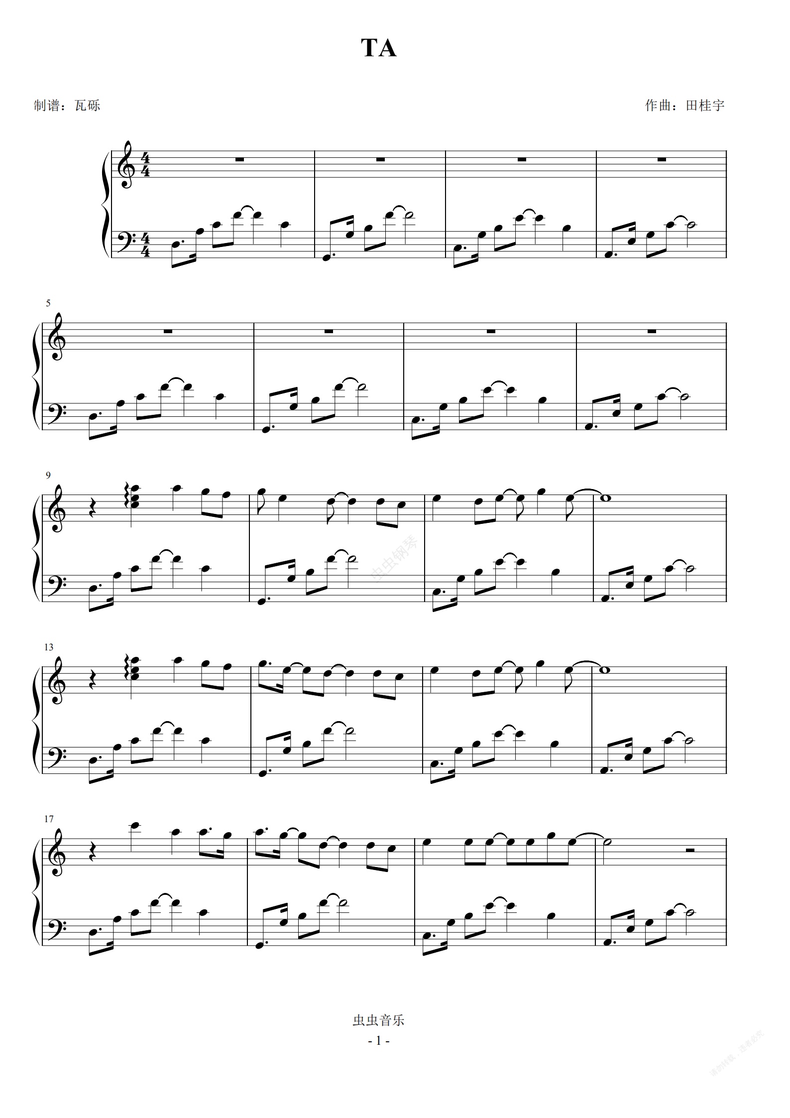 钢琴谱:TA 钢琴独奏完整版C调