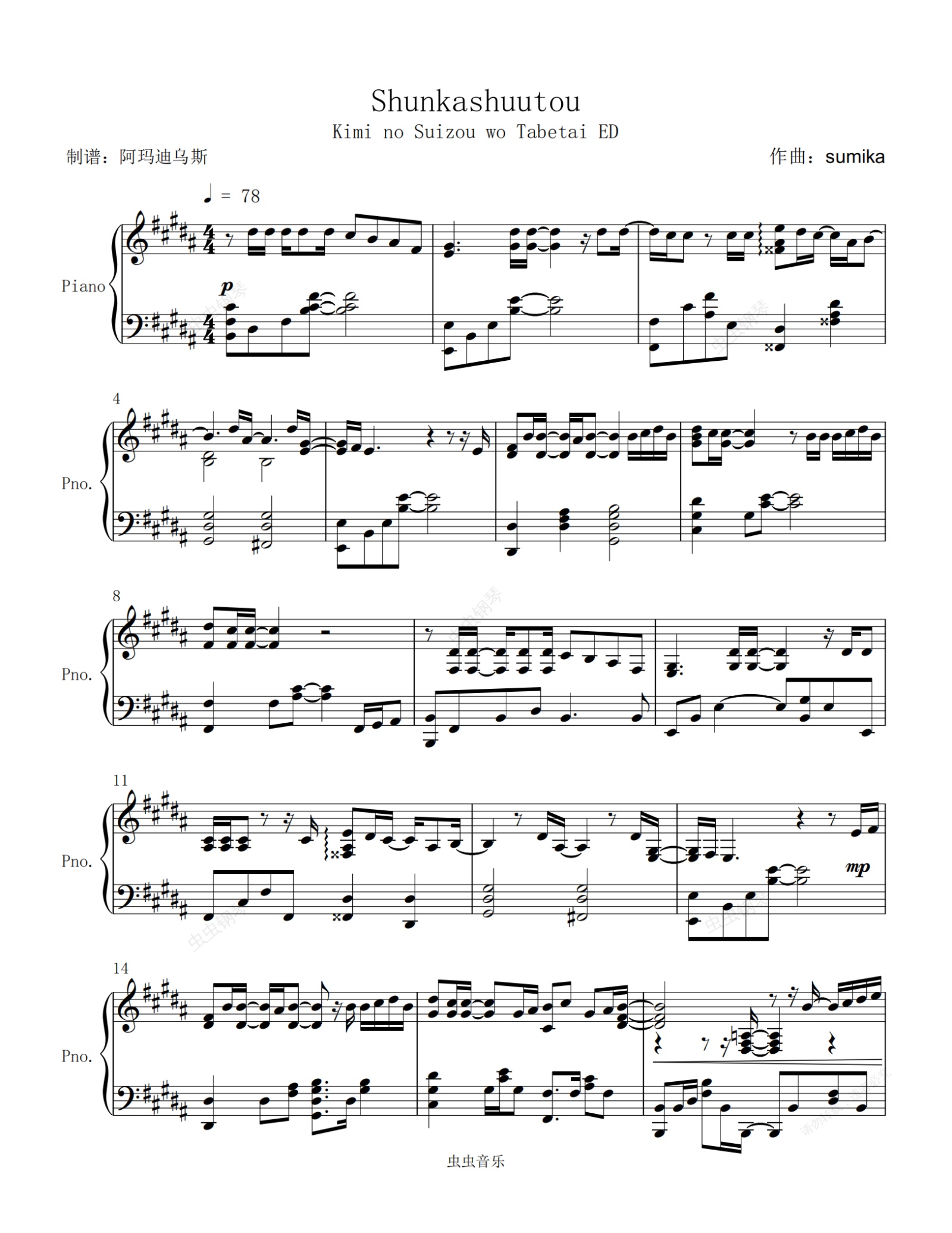 钢琴谱:我想吃掉你的胰脏 ED < 春夏秋冬 > 原调高还原完整版本