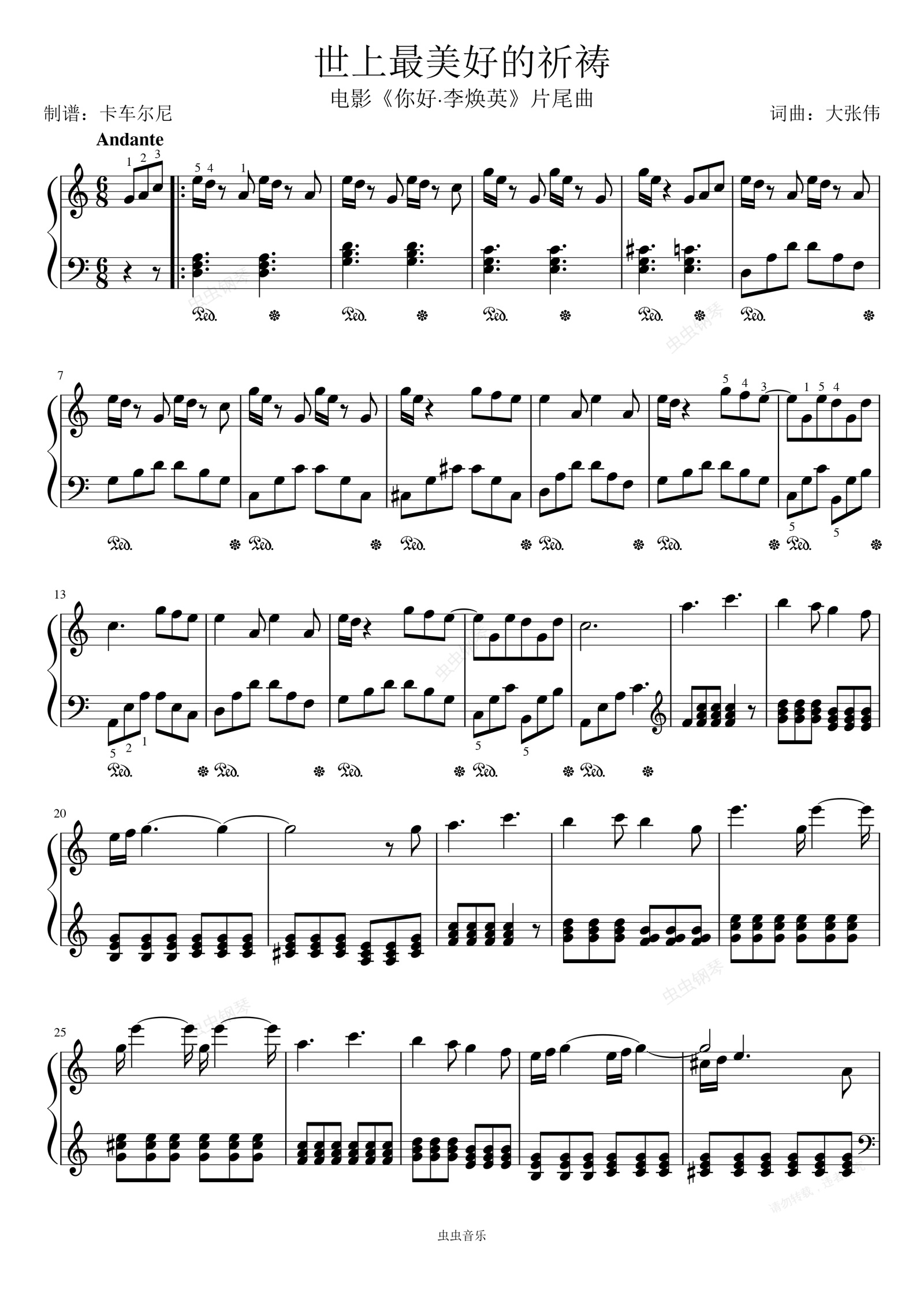 钢琴谱:《你好,李焕英》片尾曲《世上最美好的祈祷》C调简易版 带指法