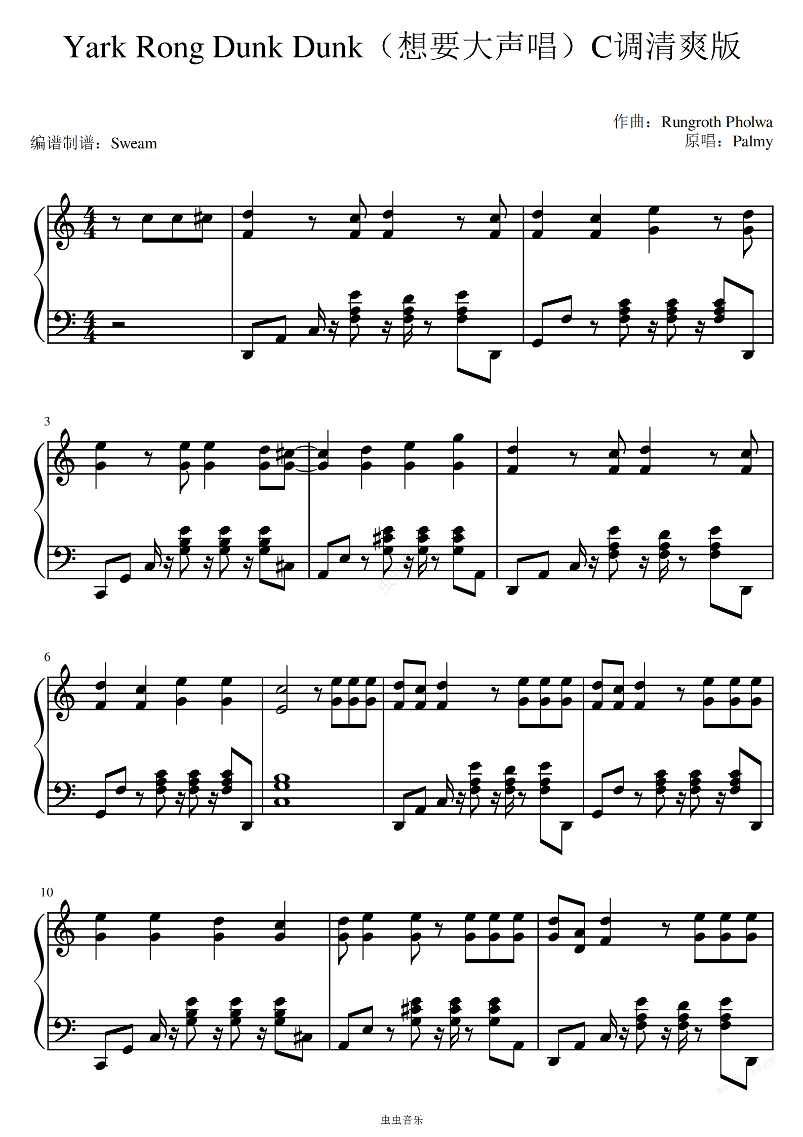钢琴谱:Yark Rong Dunk Dunk(想要大声唱)C调清爽版