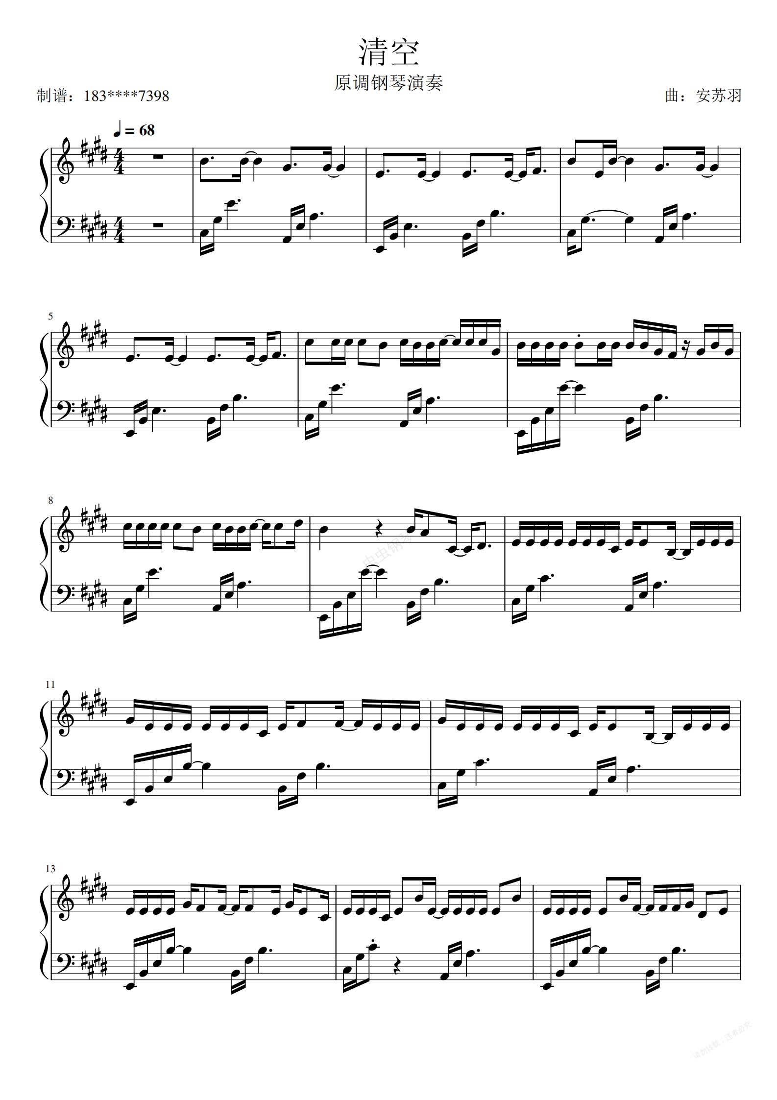 钢琴谱:清空原调钢琴弹唱