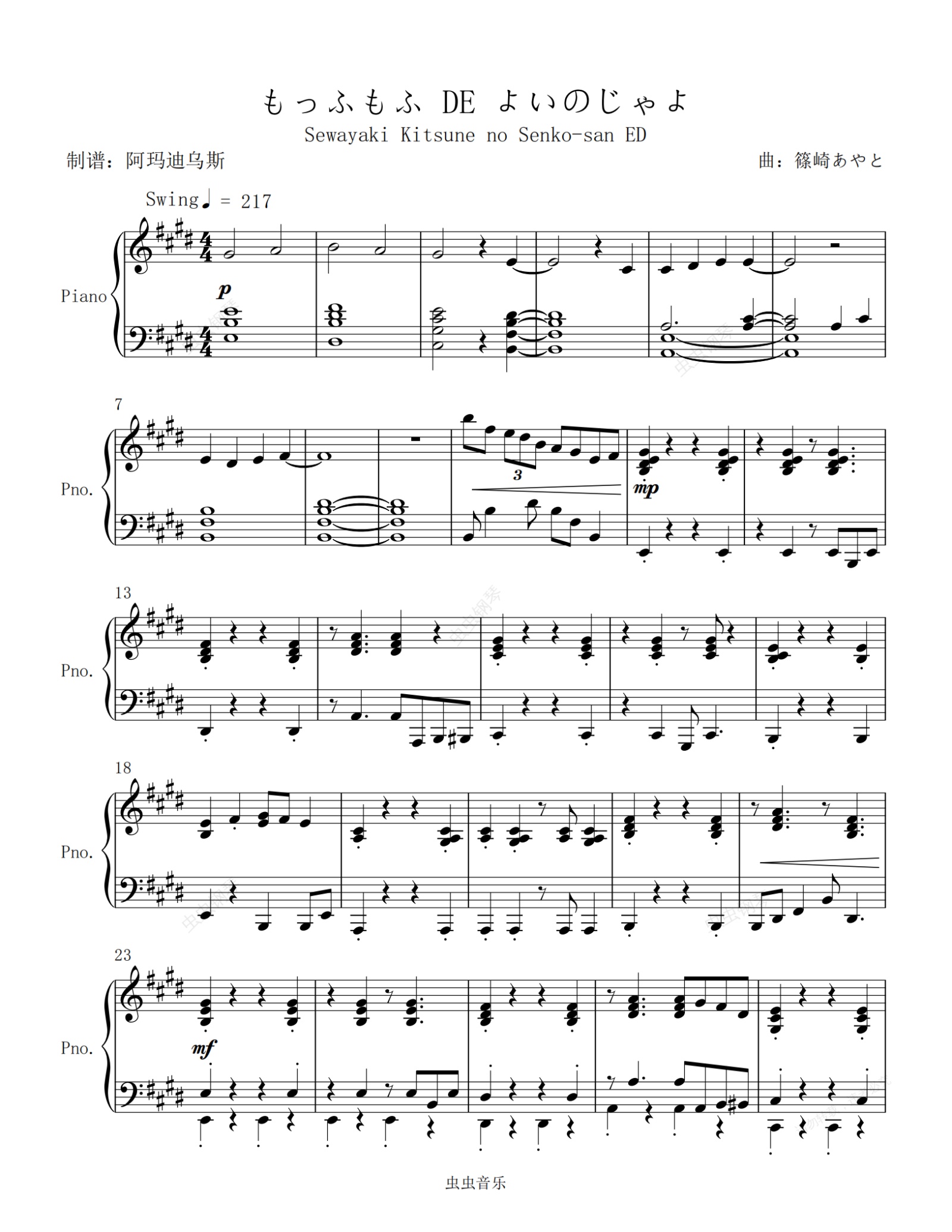 钢琴谱:贤惠幼妻仙狐小姐 ED < もっふもふ DE よいのじゃよ > 原调高还原完整版本