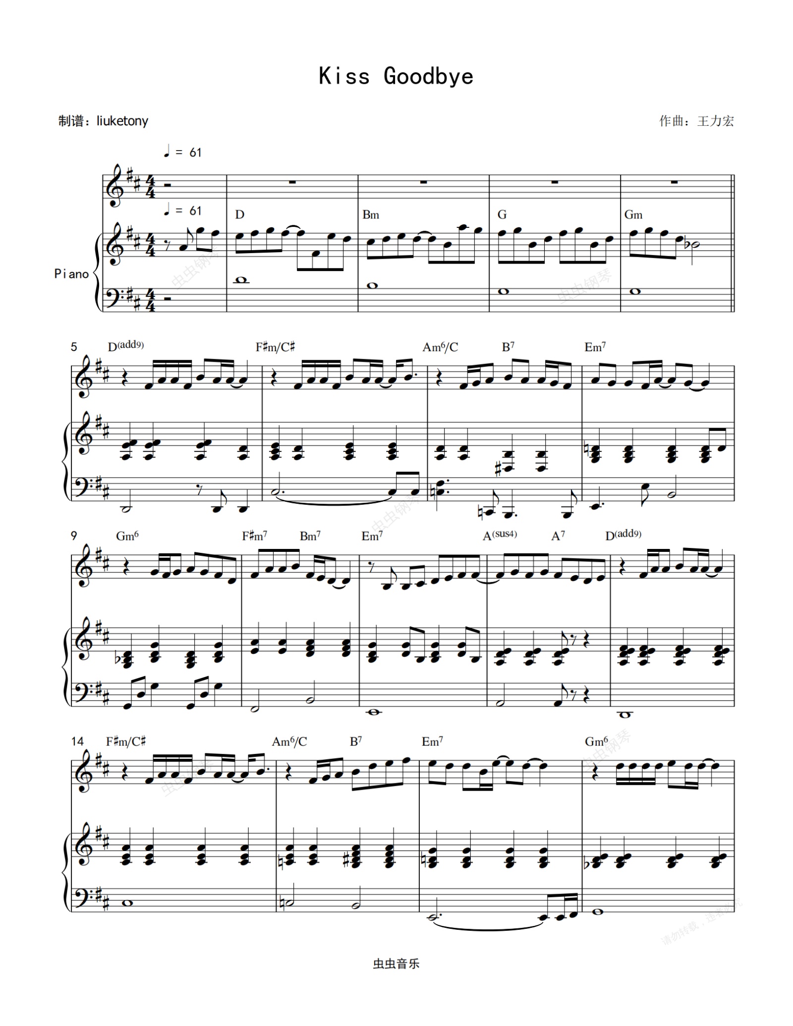 钢琴谱:Kiss Goodbye - 钢琴伴奏版(D调)原调