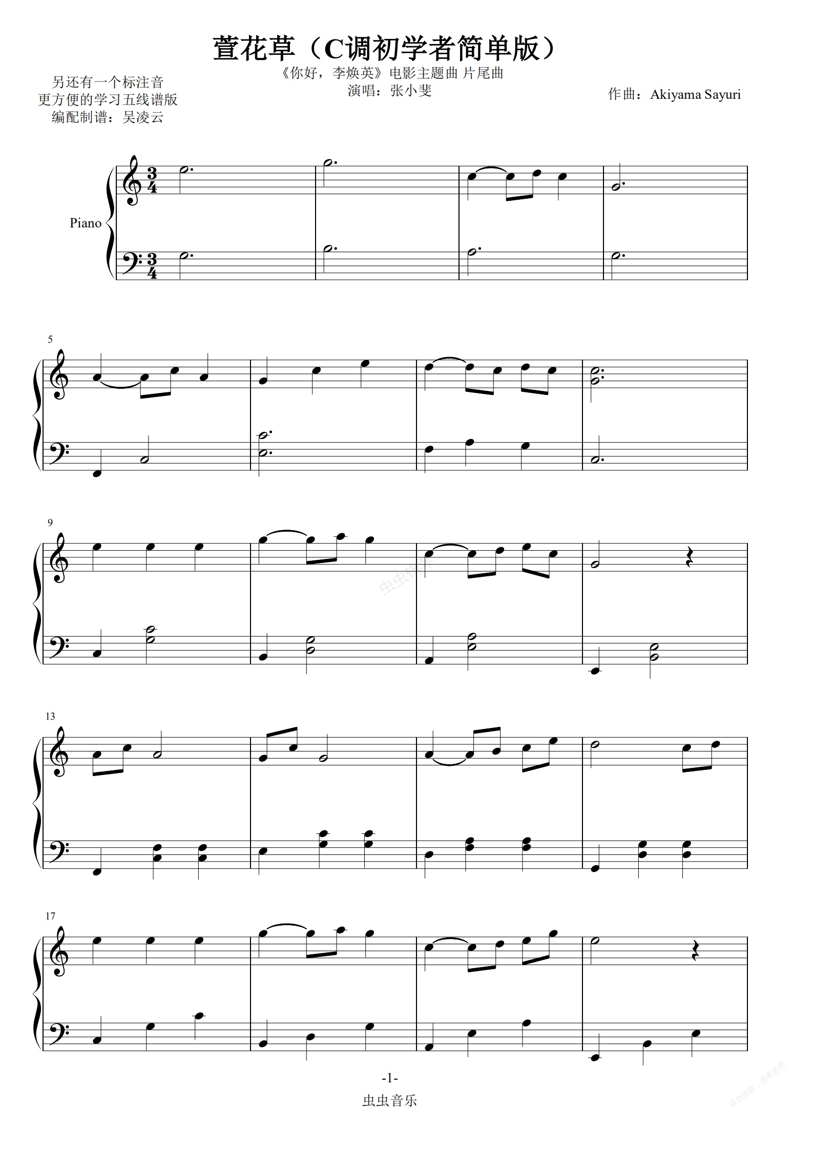 钢琴谱:萱草花(C调初学者简单版)吴凌云制作钢琴版 《你好,李焕英》电影主题曲 片尾插曲