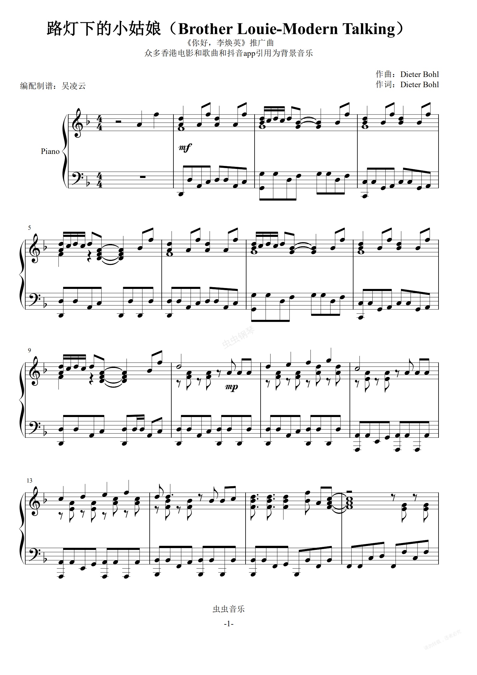 钢琴谱:路灯下的小姑娘(Brother Louie)《你好,李焕英》推广曲 Modern Talking 吴凌云钢琴独奏版