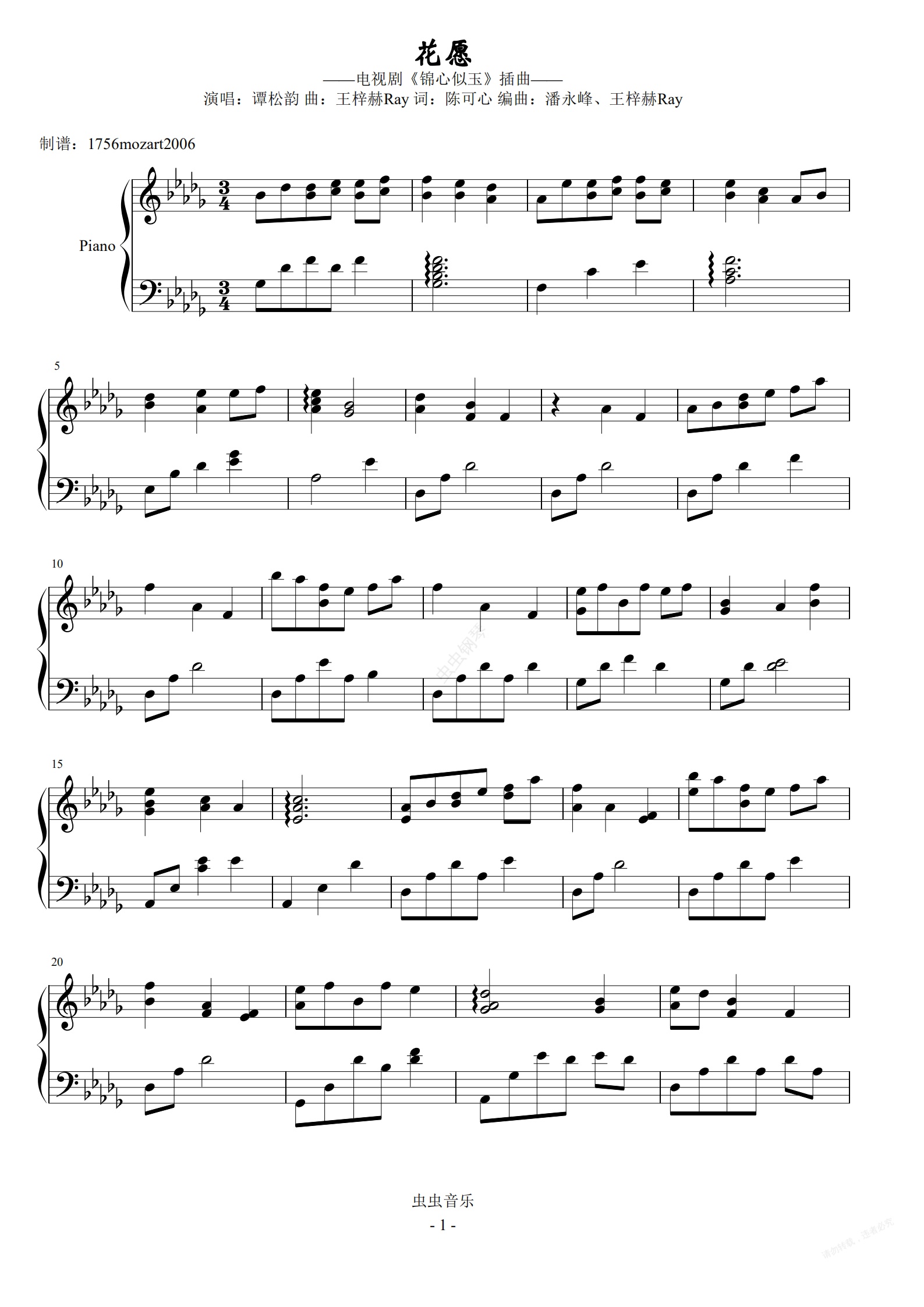 钢琴谱:花愿-谭松韵(原调完整版)
