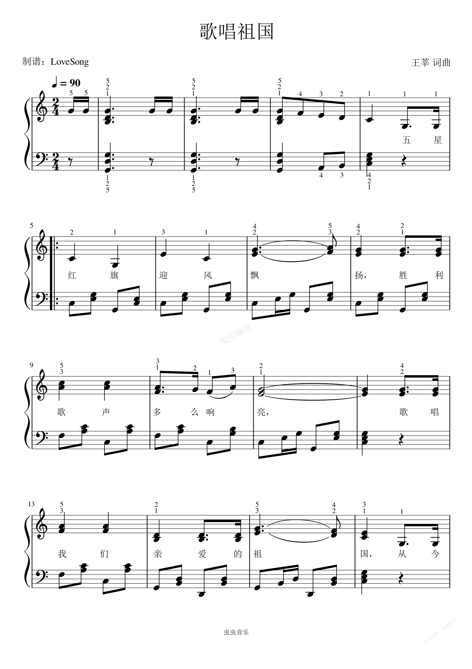 钢琴谱:歌唱祖国 简易好听 带指法