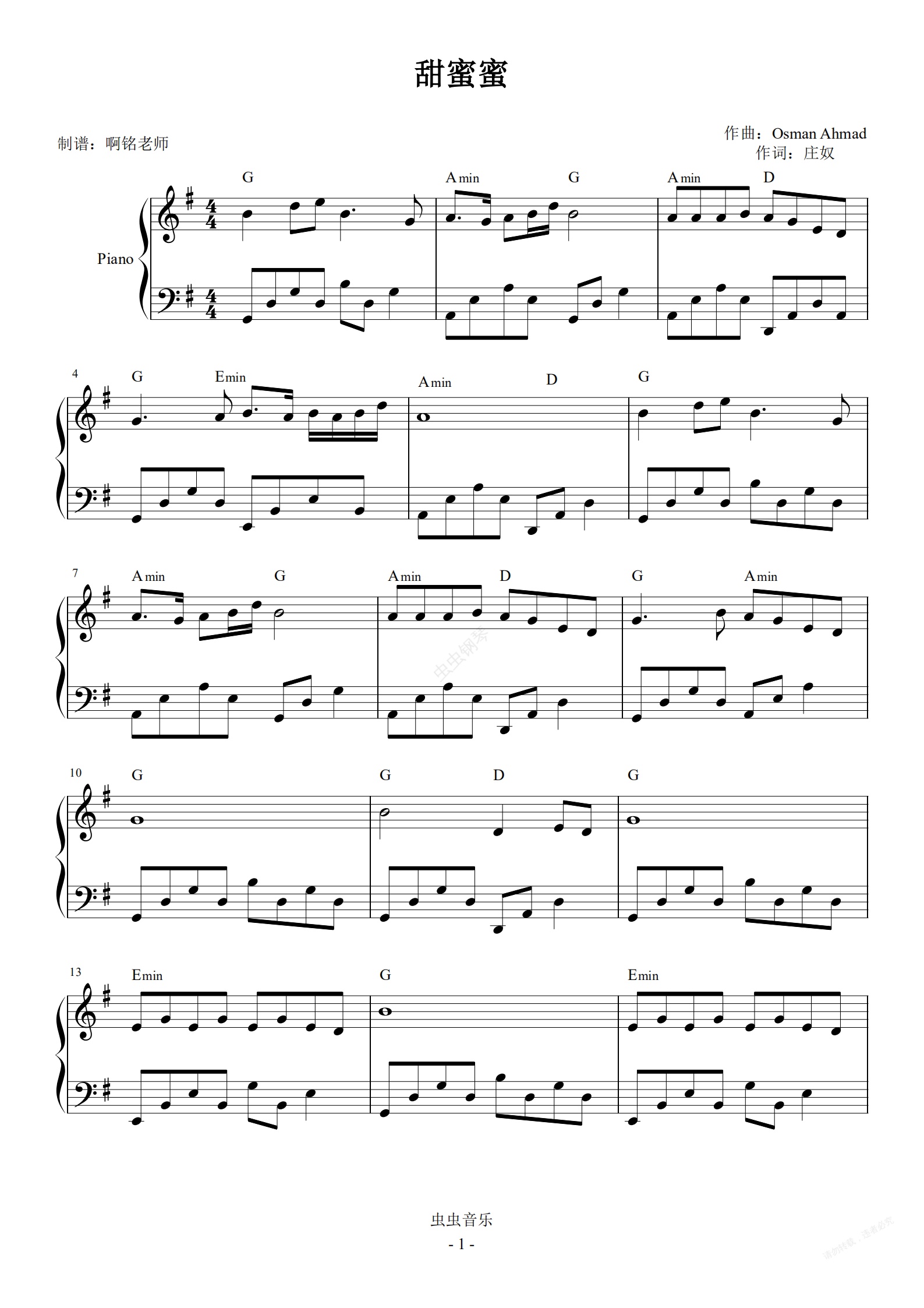 钢琴谱:甜蜜蜜 G调简易 怀旧经典