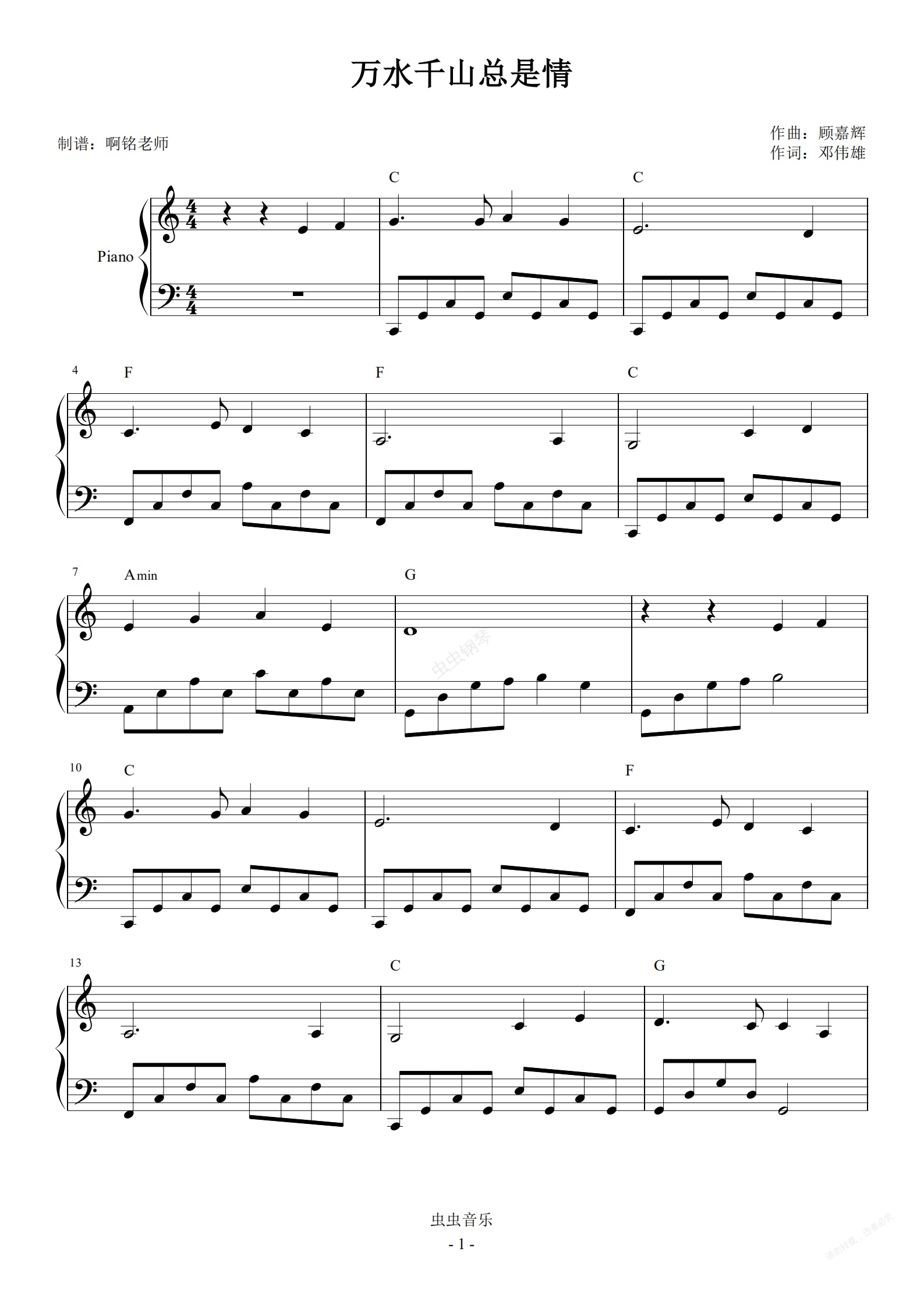 钢琴谱:万水千山总是情 C调简易 怀旧经典