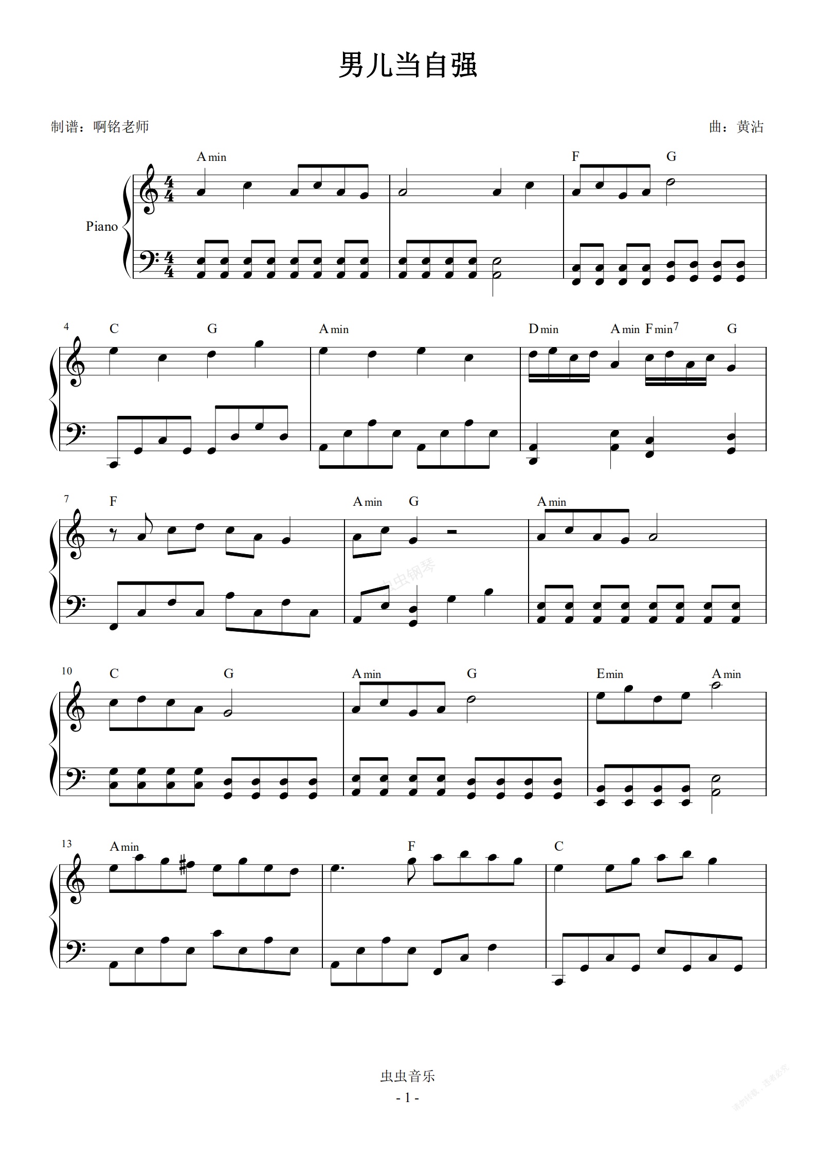 钢琴谱:男儿当自强 C调简易 怀旧经典