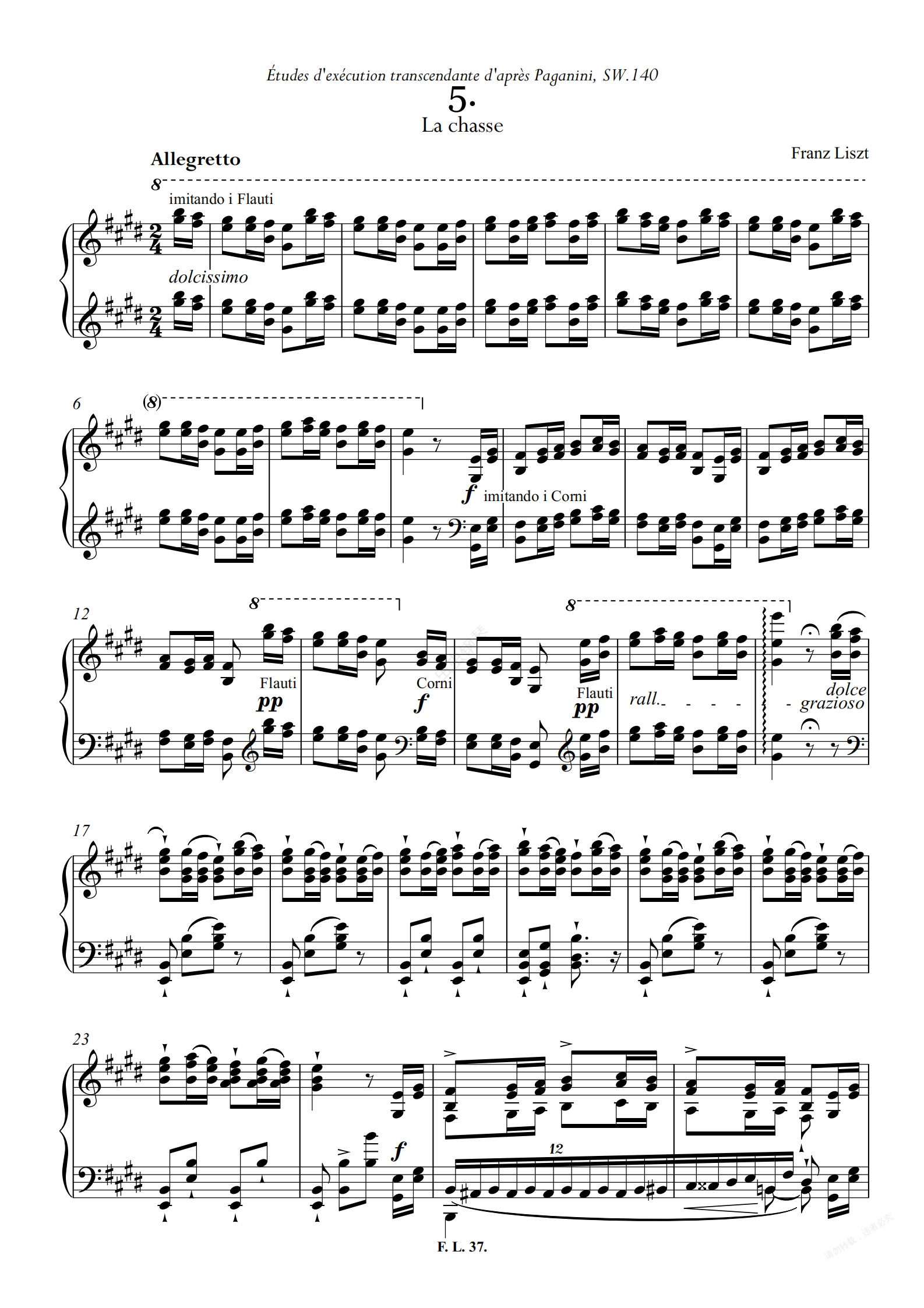 钢琴谱:SW.140, No.5 "La chasse"(狩猎,根据帕格尼尼所作的超技练习曲,第5首)Études d'exécution transcendante d'après Paganini, SW.140 No.5 "La Chasse"