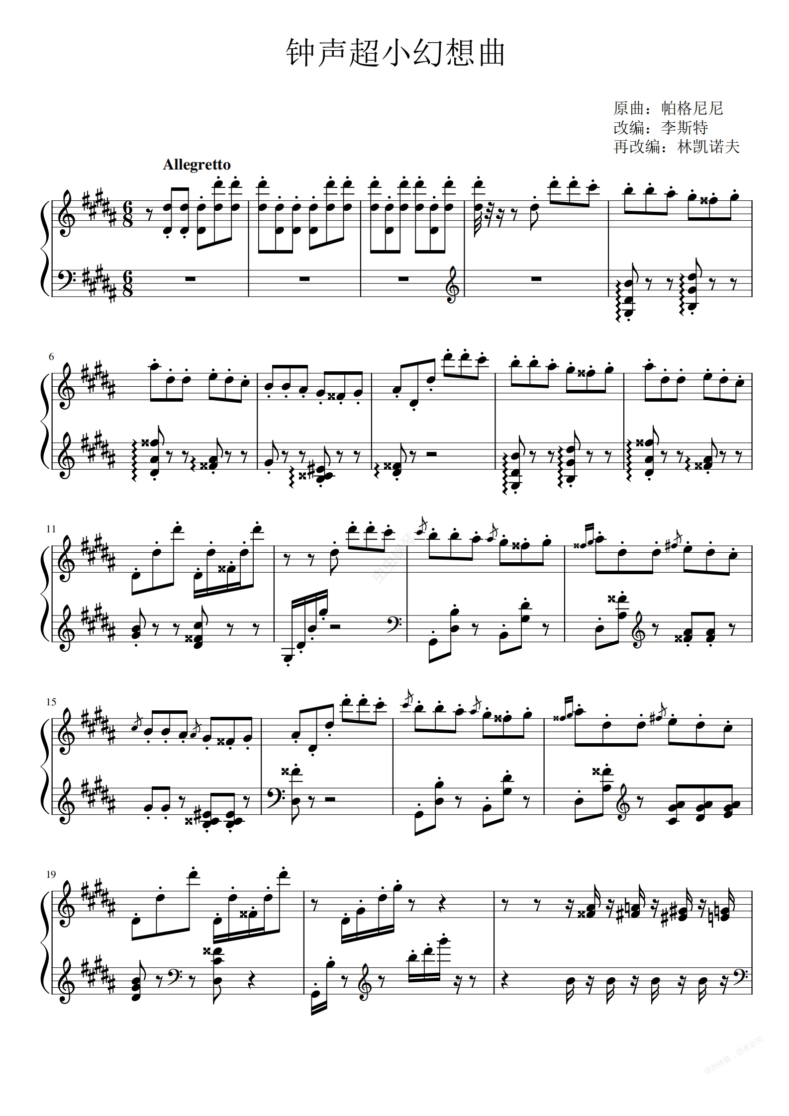 虽然大佬们常常说,钟其实不是什么高难度的东西,但那毕竟是大佬。对于咱来说,这首曲子如同魔鬼一样。而钟本来就是一首很好听的曲子,为了让各位广大琴友体会到钟的魅力,我将难度削减到零基础都能磨出来的级别。嘛,原曲15页,我这个改编下来只有3页就草草结束,因为后面的东西再改也压不了啥难度了,我的标准是零基础的童鞋都能磨出来。。希望李斯特爷爷泉下若是有知不要一拳就把我鼻子打骨折了,音乐界,要以和为贵,不是,好勇斗狠,我劝!这位李斯特啊,耗子尾汁,好好反思,以后不要再犯,这样的聪明了······