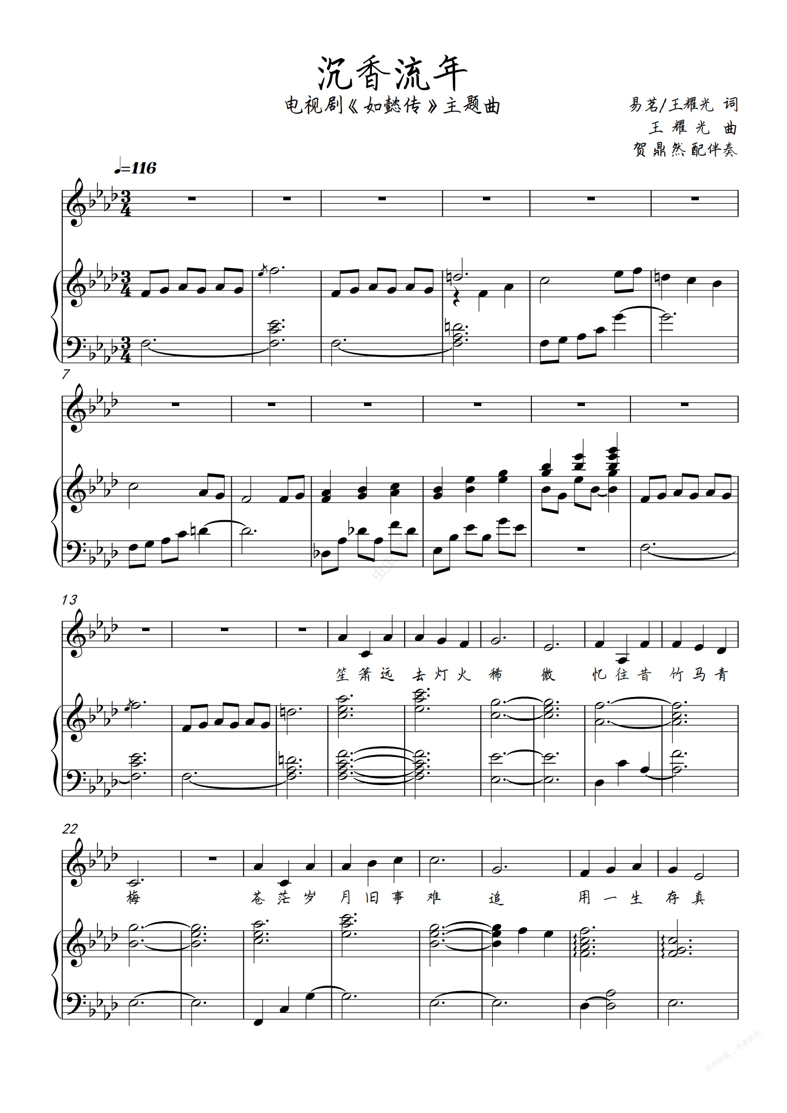 钢琴谱:沉香流年-雷佳 钢琴伴奏正谱