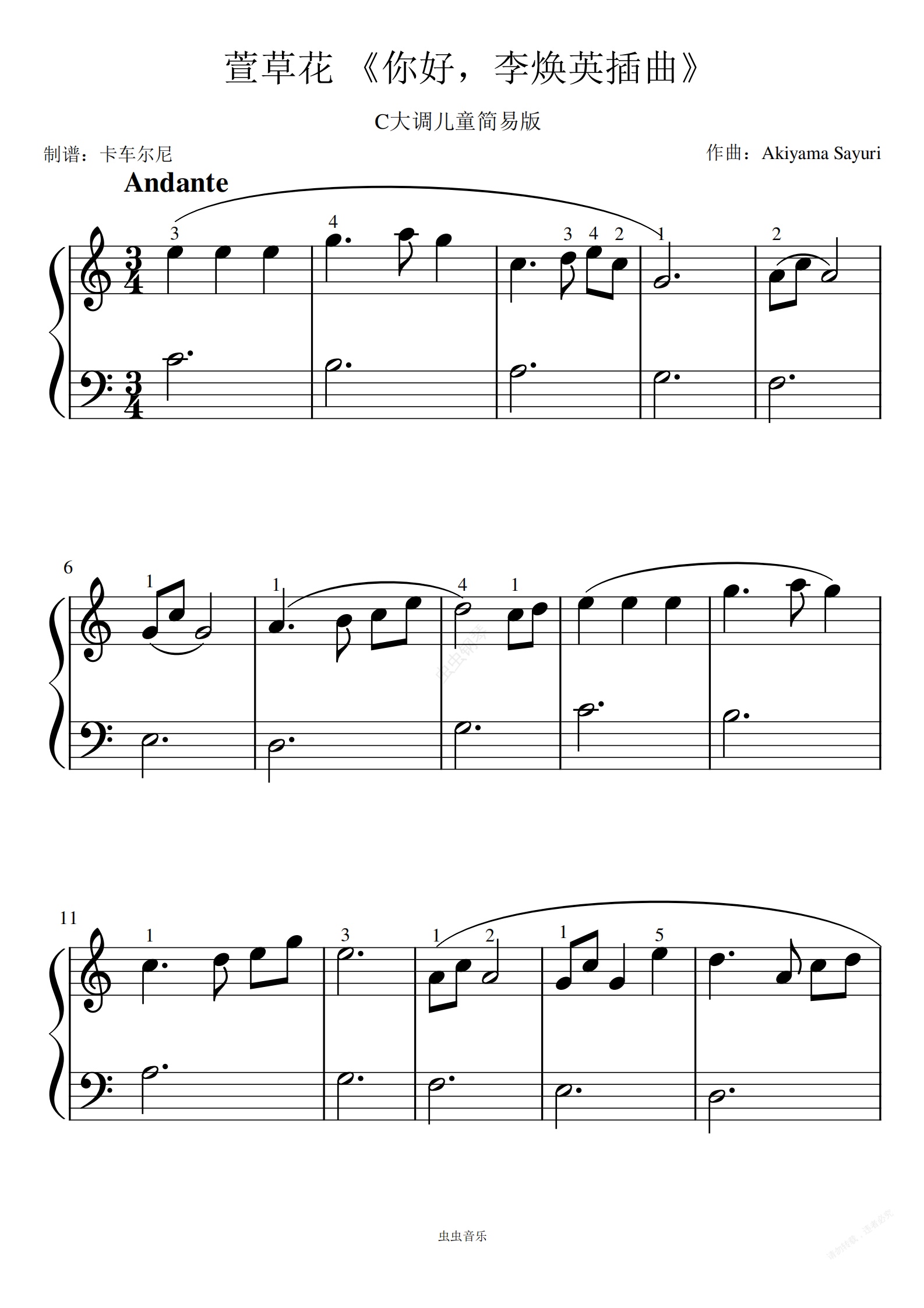 钢琴谱:萱草花 大音符儿童简易版带指法