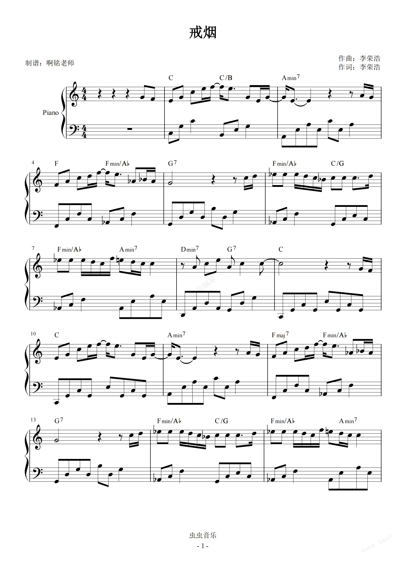 钢琴谱:戒烟 C调 最易上手