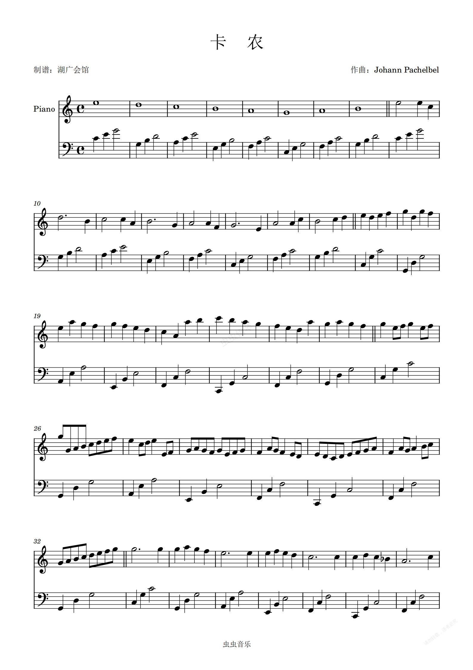 钢琴谱:卡农 C调 钢琴双手简谱 容易上手简易版