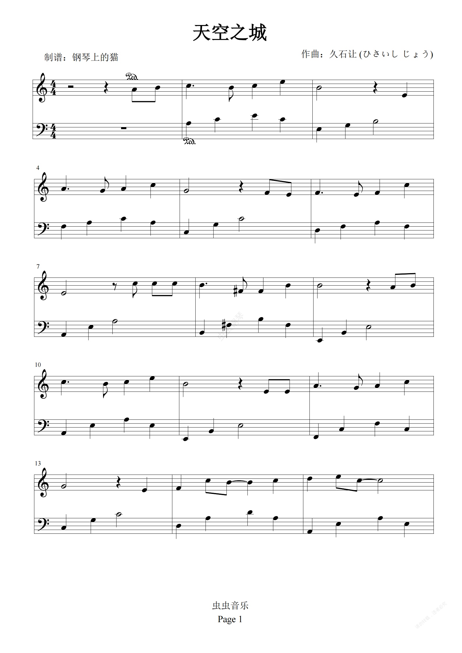 钢琴谱:天空之城 C调 钢琴双手简谱 容易上手简易版