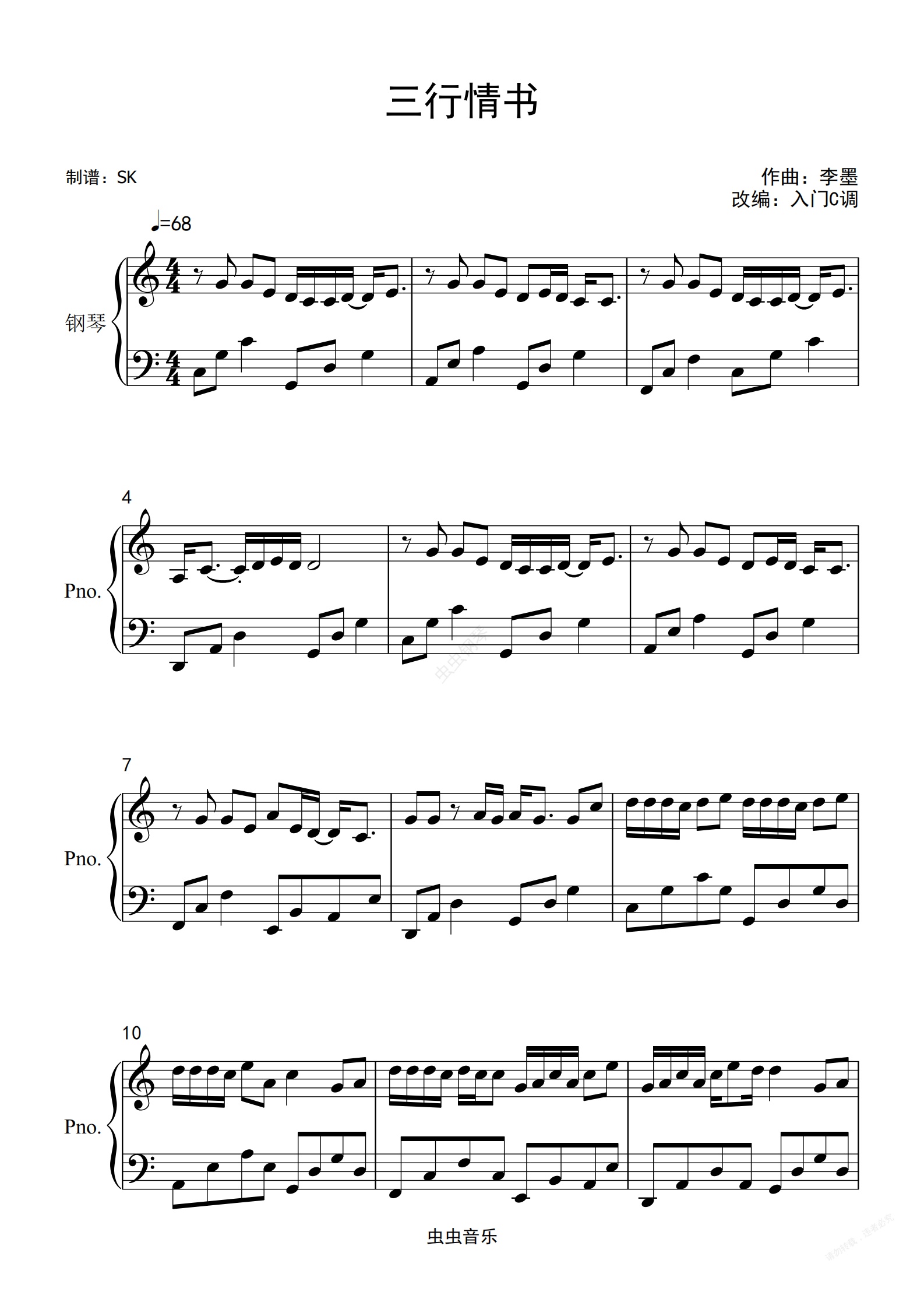 钢琴谱:蔡文泽《三行情书》C调简单版