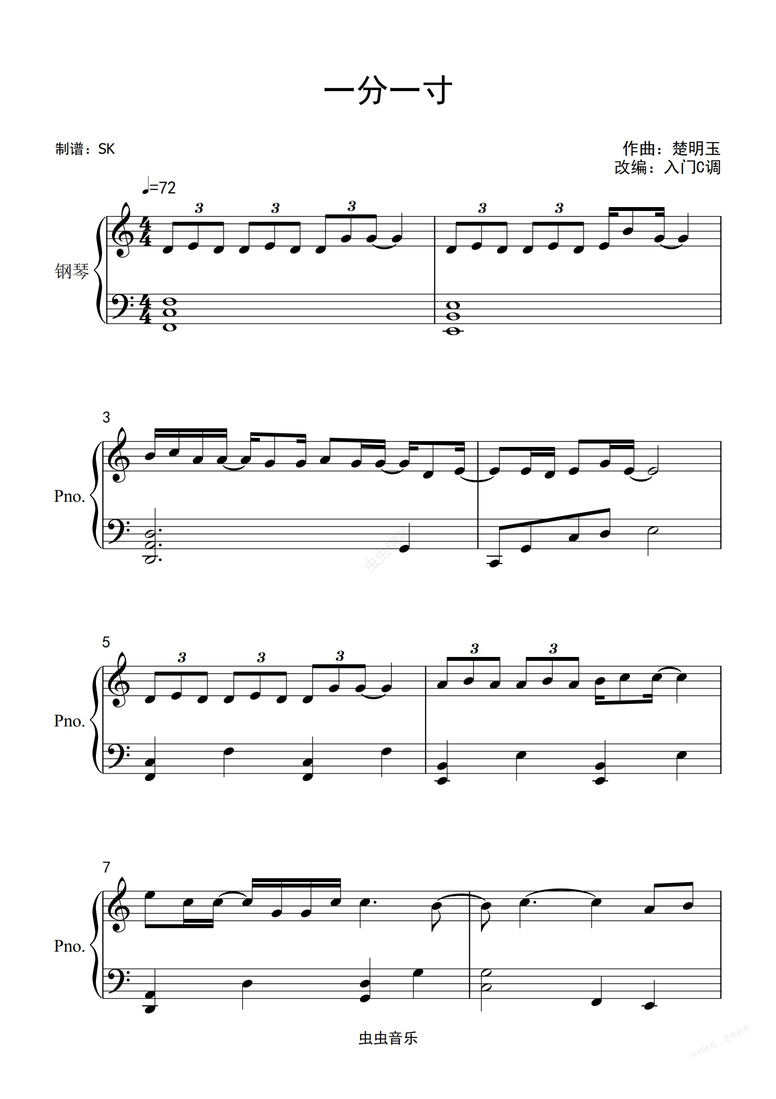 钢琴谱:阿YueYue《一分一寸》C调简单版