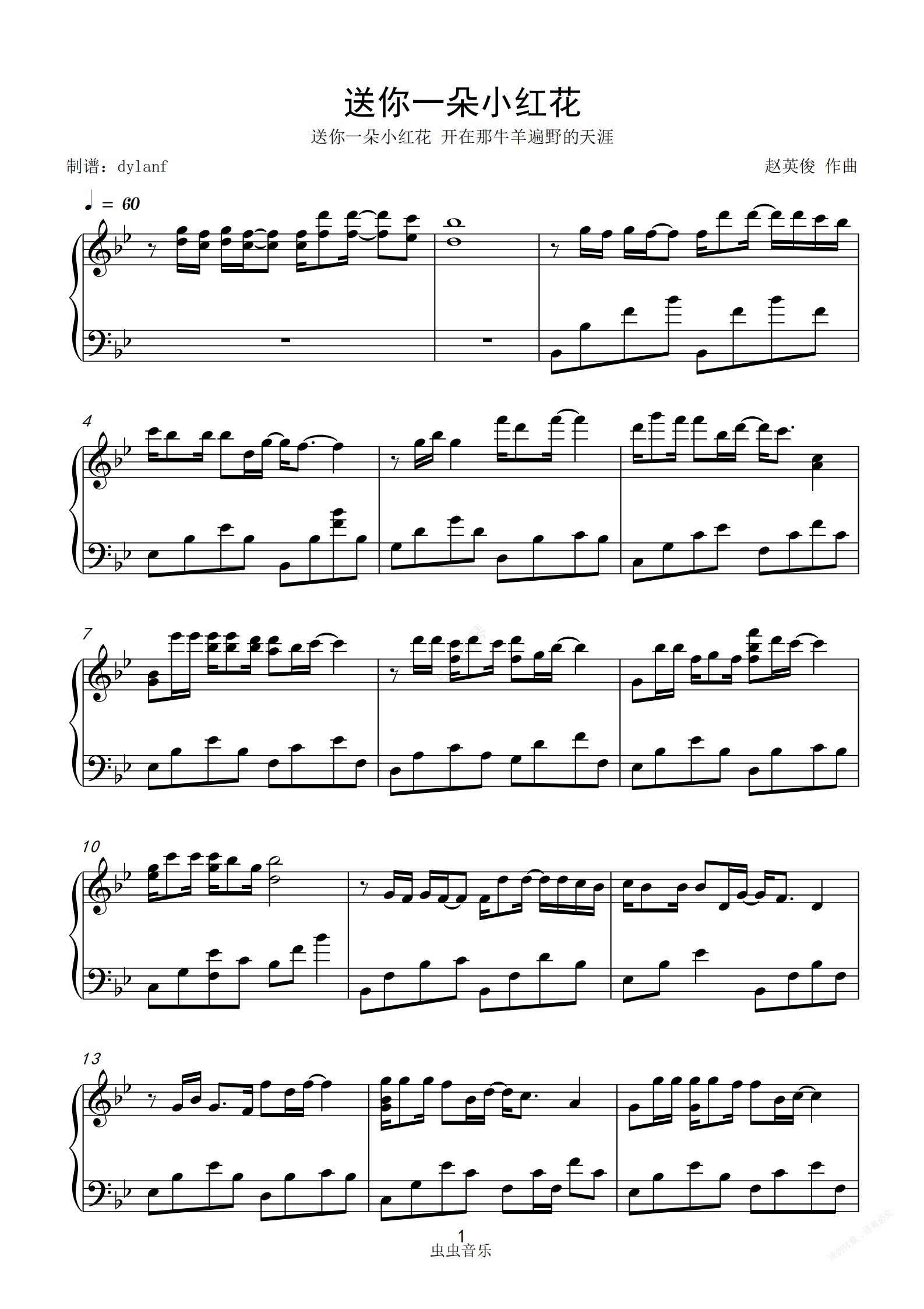 钢琴谱:送你一朵小红花 唯美版 原调 好听易弹