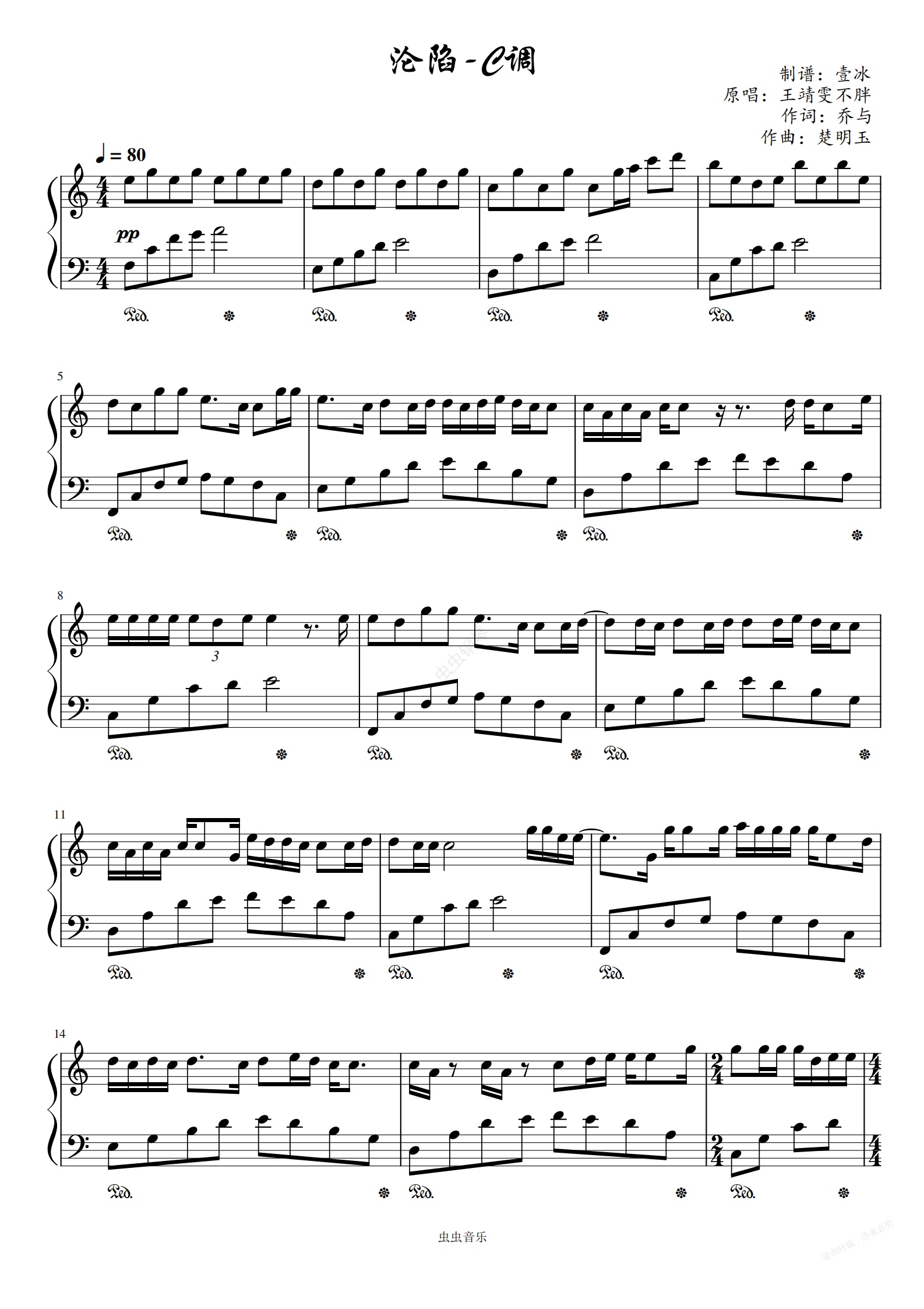 钢琴谱:沦陷//王靖雯不胖-C调简单易上手