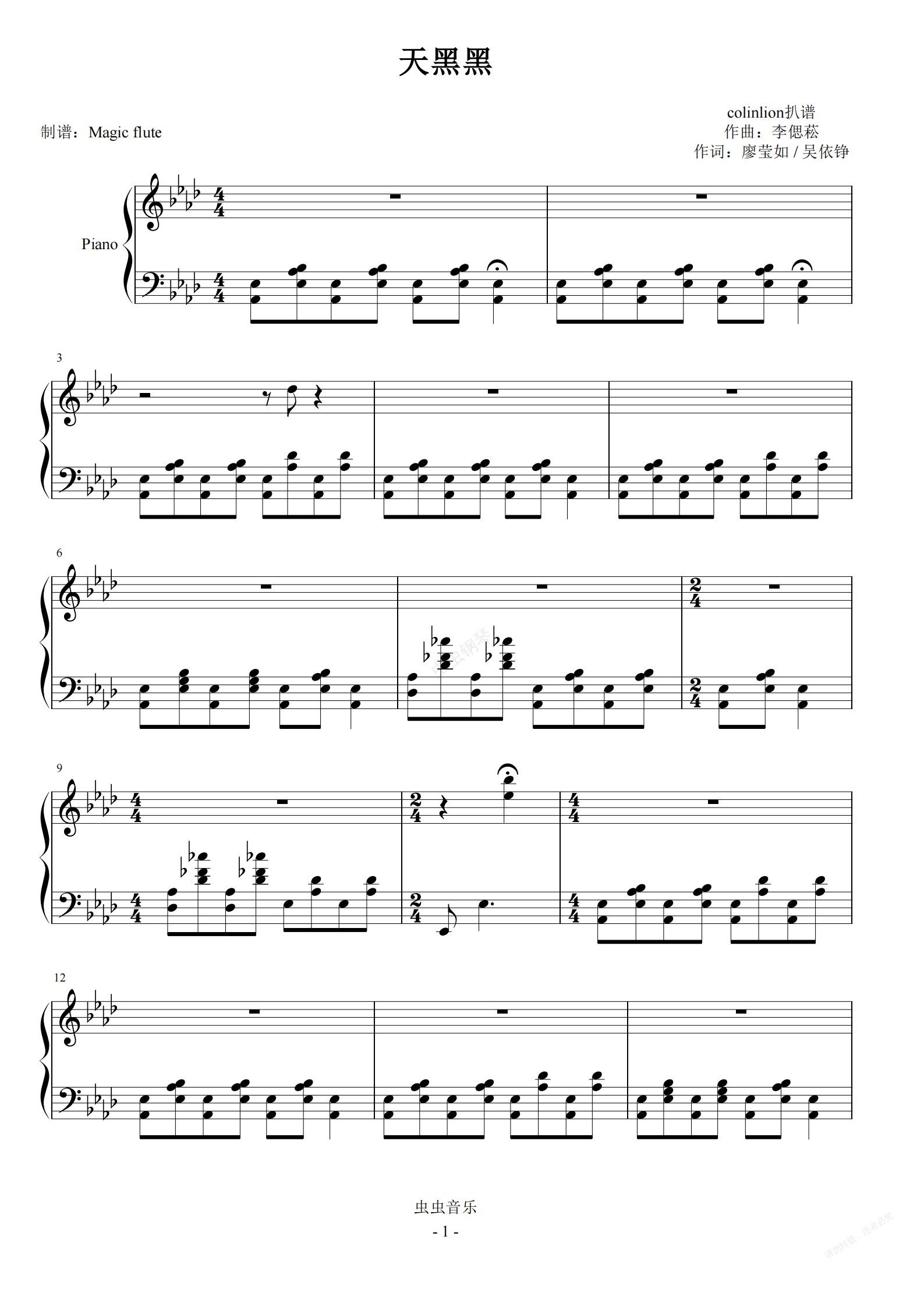 钢琴谱:天黑黑(伴奏)-孙燕姿