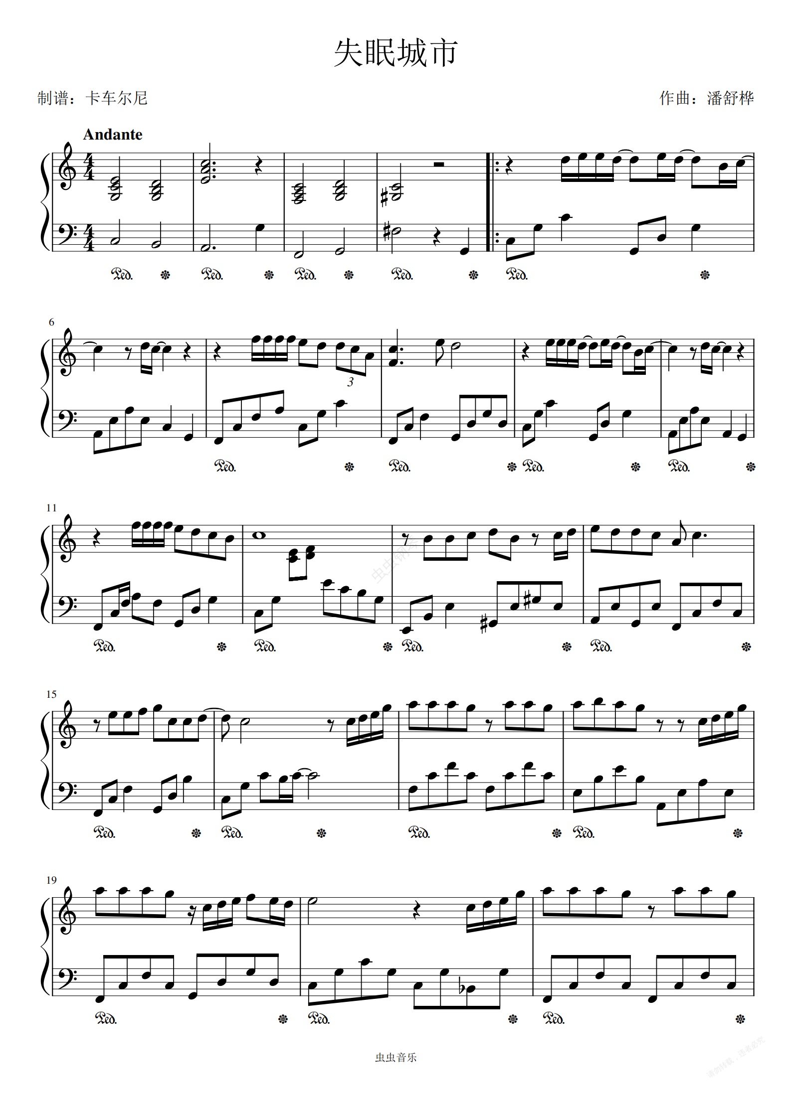钢琴谱:失眠城市 C大调简易版 是你的垚演唱