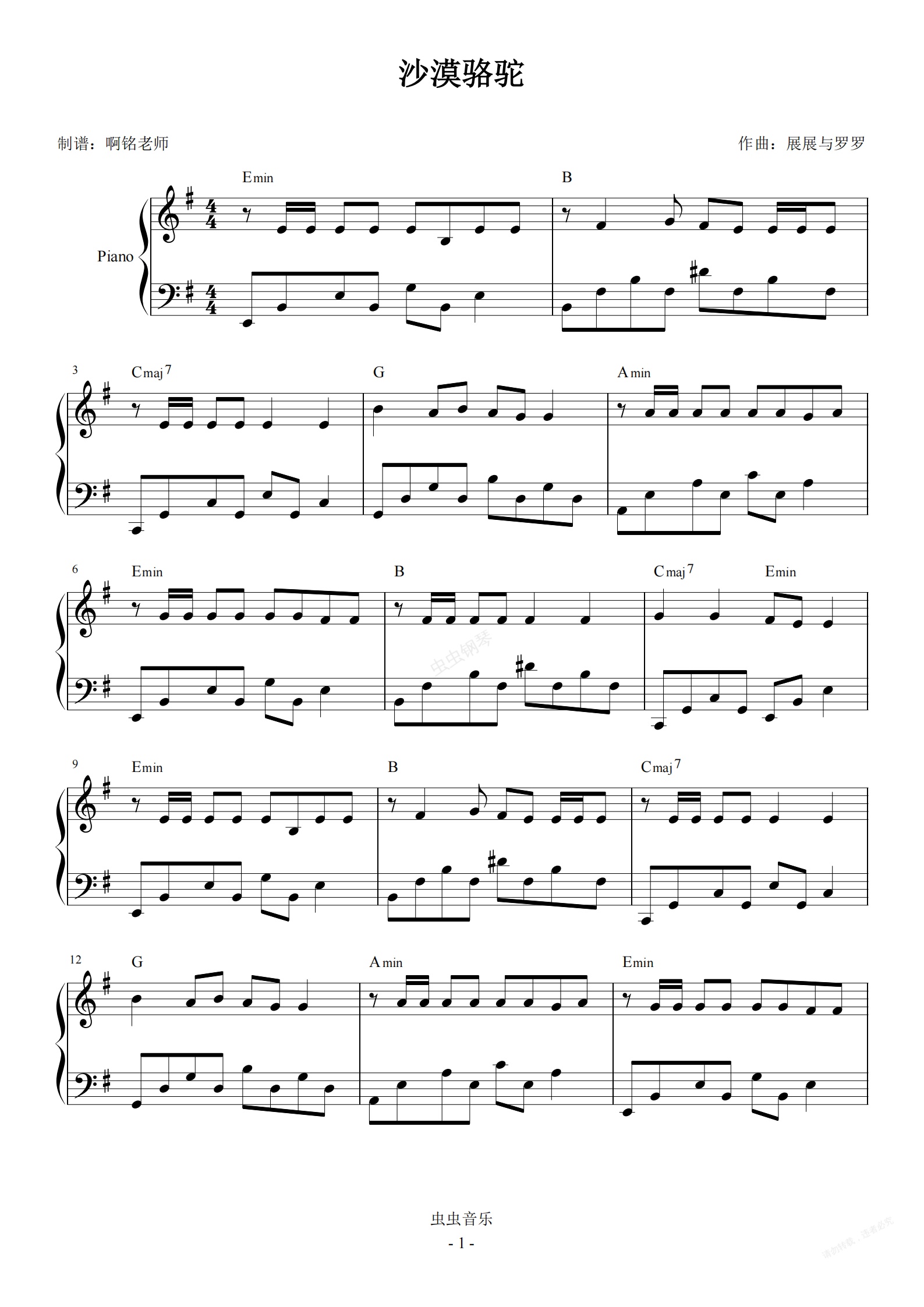 钢琴谱:沙漠骆驼 G调 最易上手