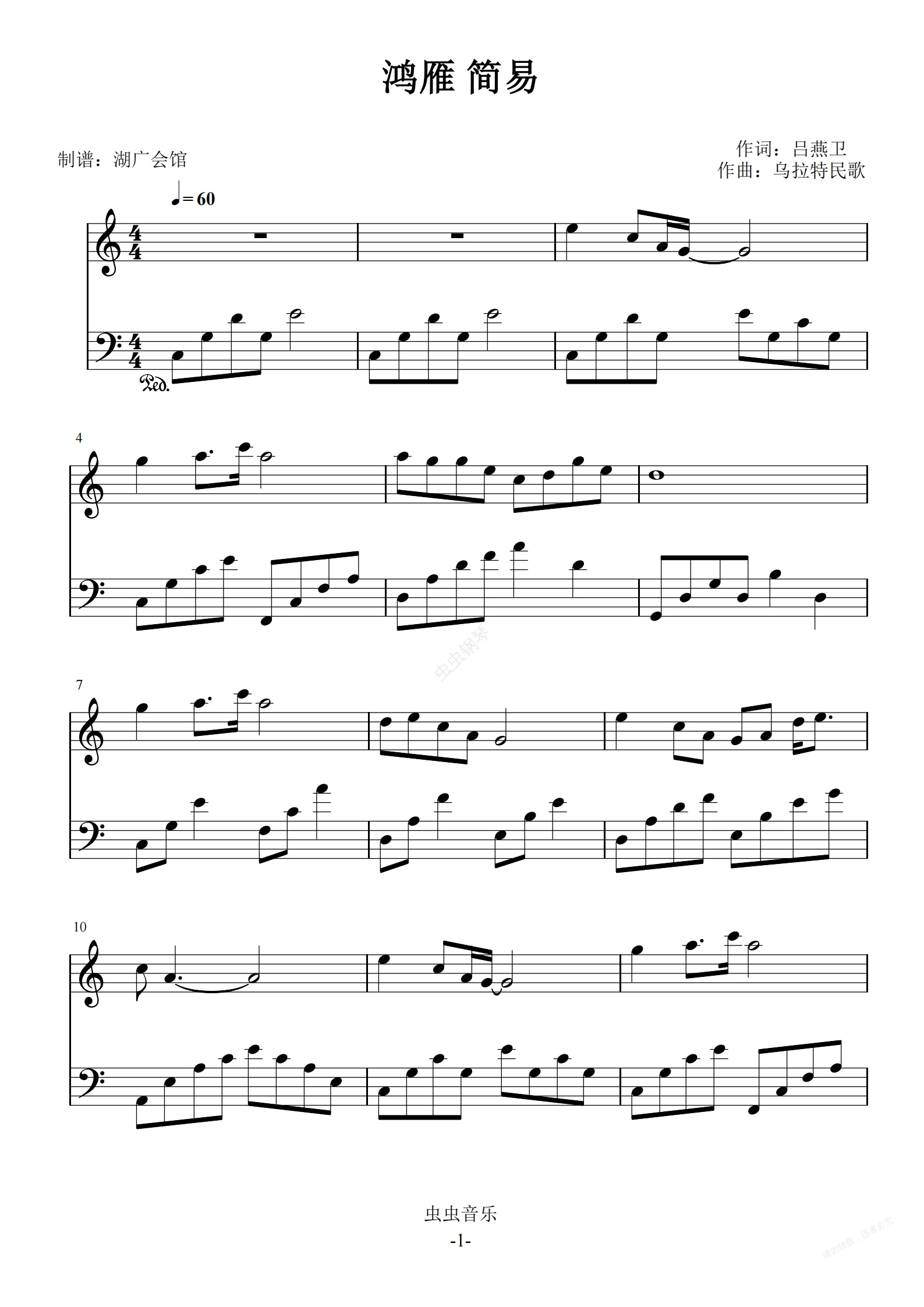 钢琴谱:鸿雁 C调 简易版本容易弹